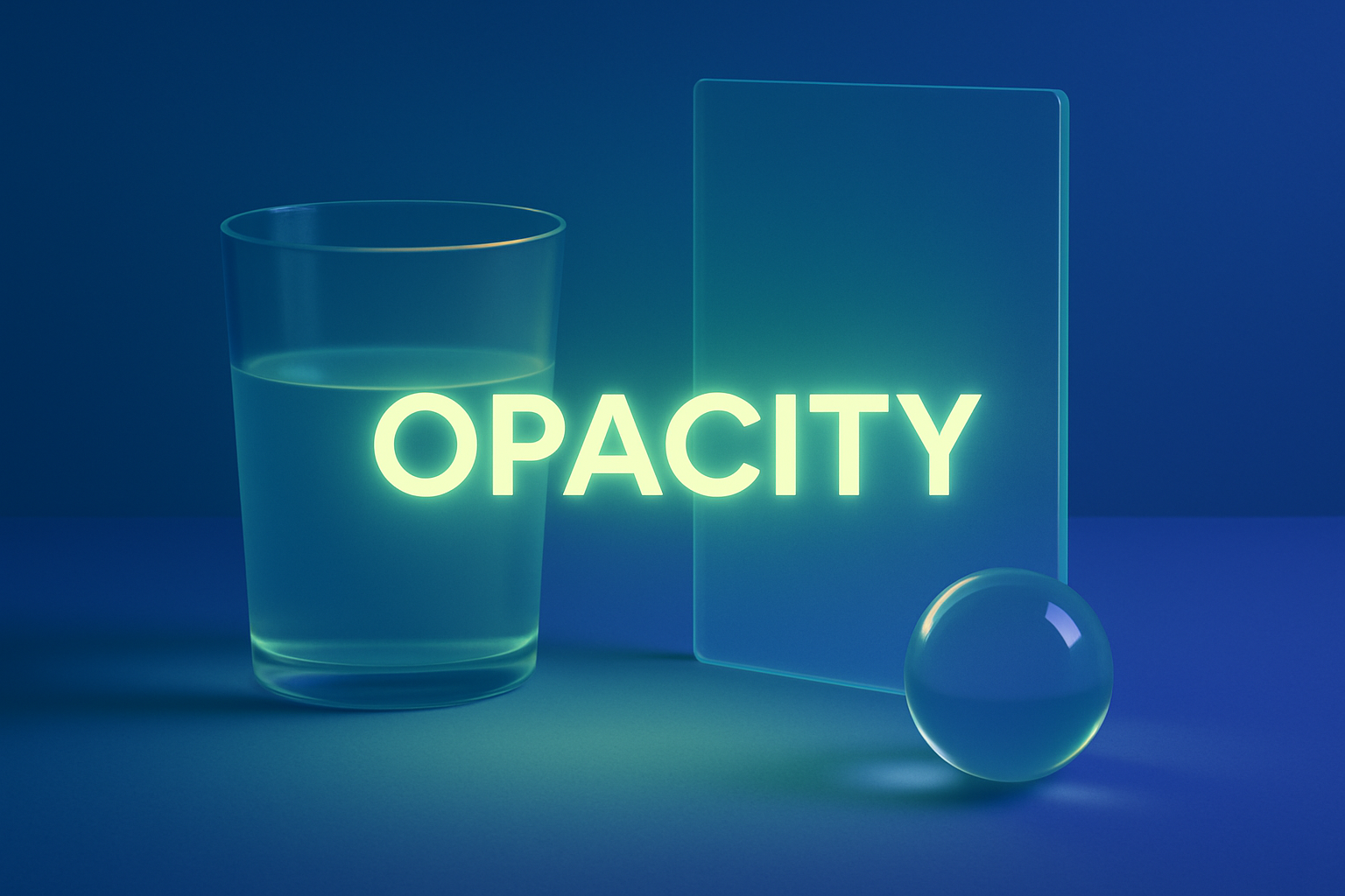 /Collection: /by davooda/Type: PNG/The image features the word 'OPACITY' glowing softly, surrounded by a glass of water, a transparent sheet, and a sphere. The colors range from blue to violet, creating a serene atmosphere.