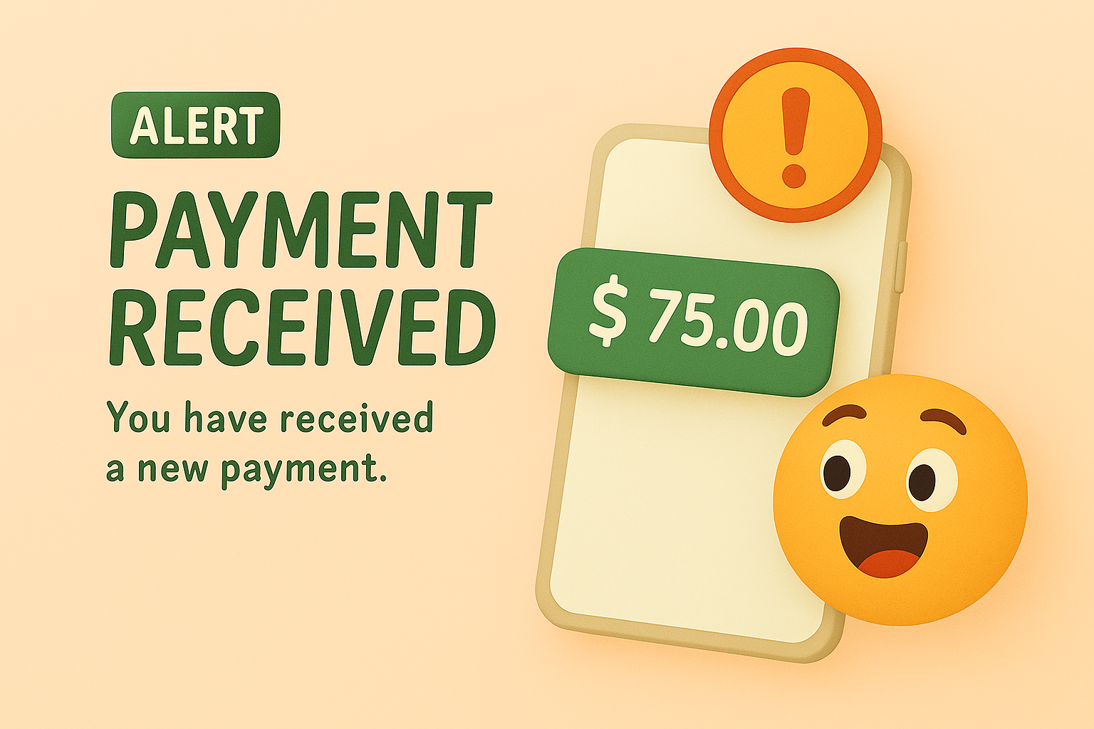 Vibrant digital notification graphic showcasing a payment confirmation with playful elements, ideal for finance apps or payment platforms.
