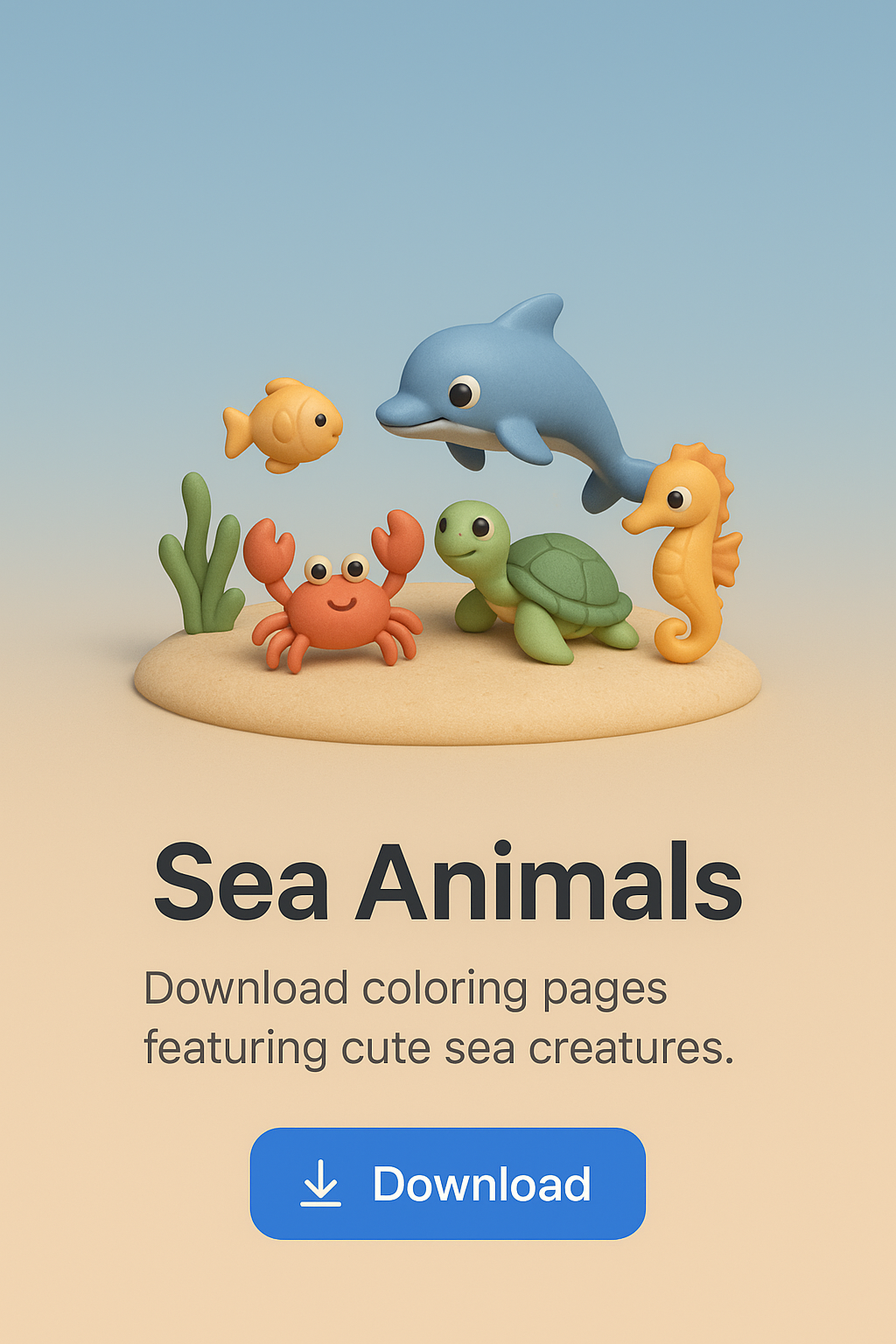 A delightful scene featuring a dolphin, crab, turtle, seahorse, and fish, designed for children's coloring pages. The 3D illustration showcases these sea creatures in a playful, engaging environment.