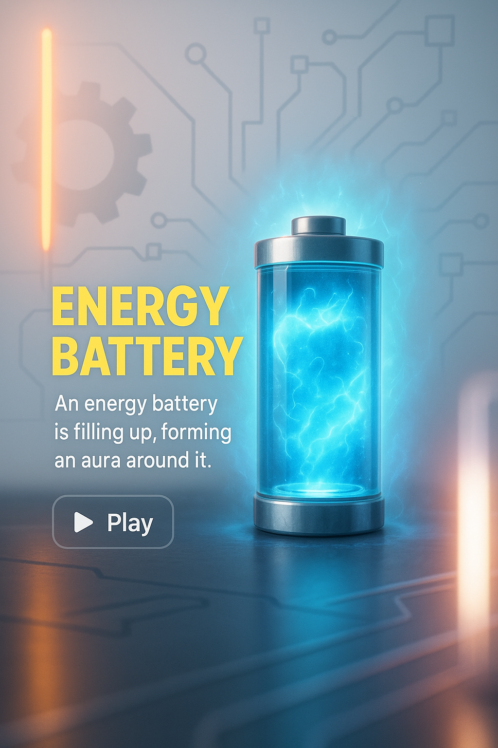 3D digital rendering of an energy battery filling up, surrounded by a glowing aura. Ideal for technology and innovation presentations or marketing materials.