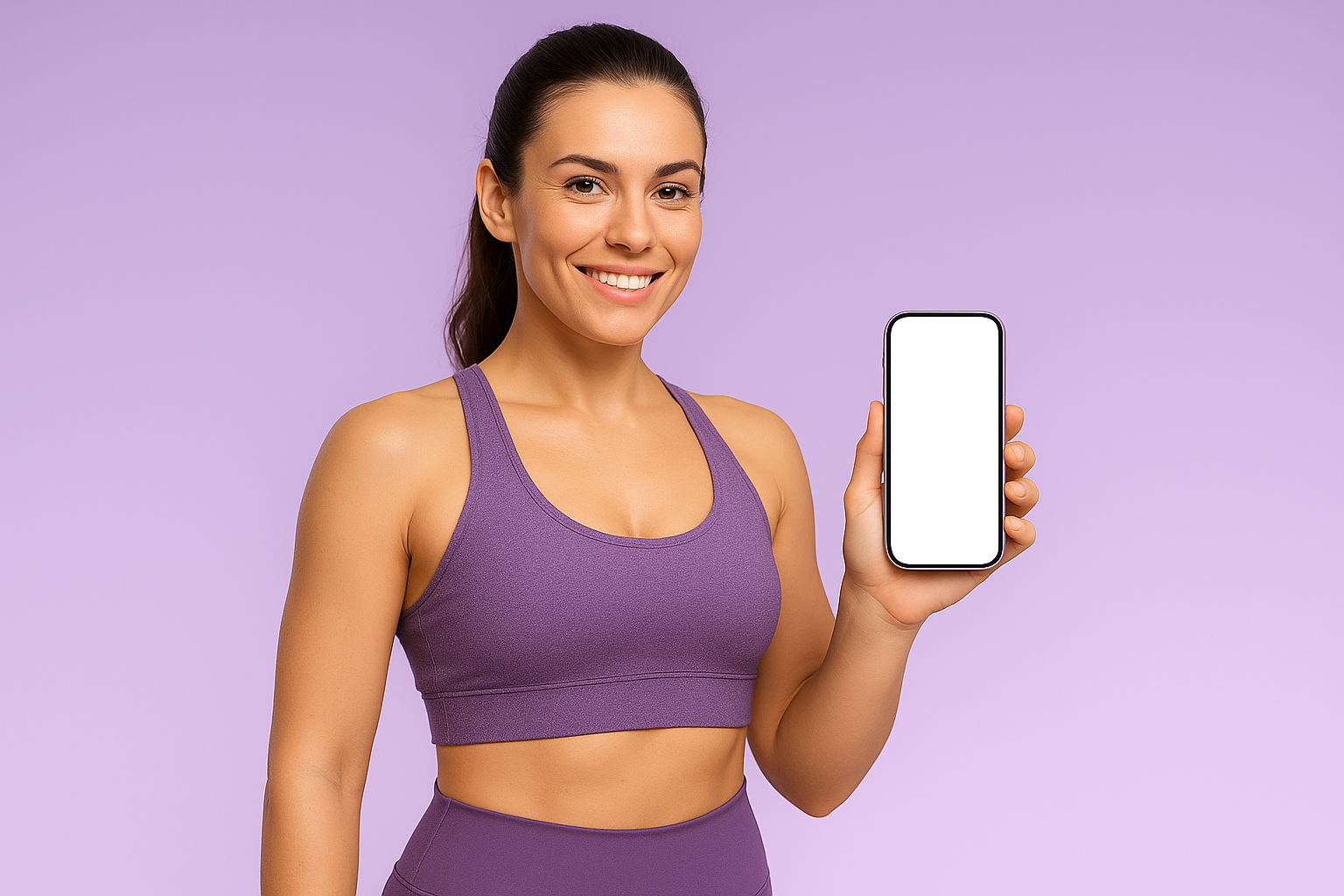 A female fitness trainer in a purple sports outfit smiles while holding a smartphone with a blank screen. The background is a soft purple gradient.