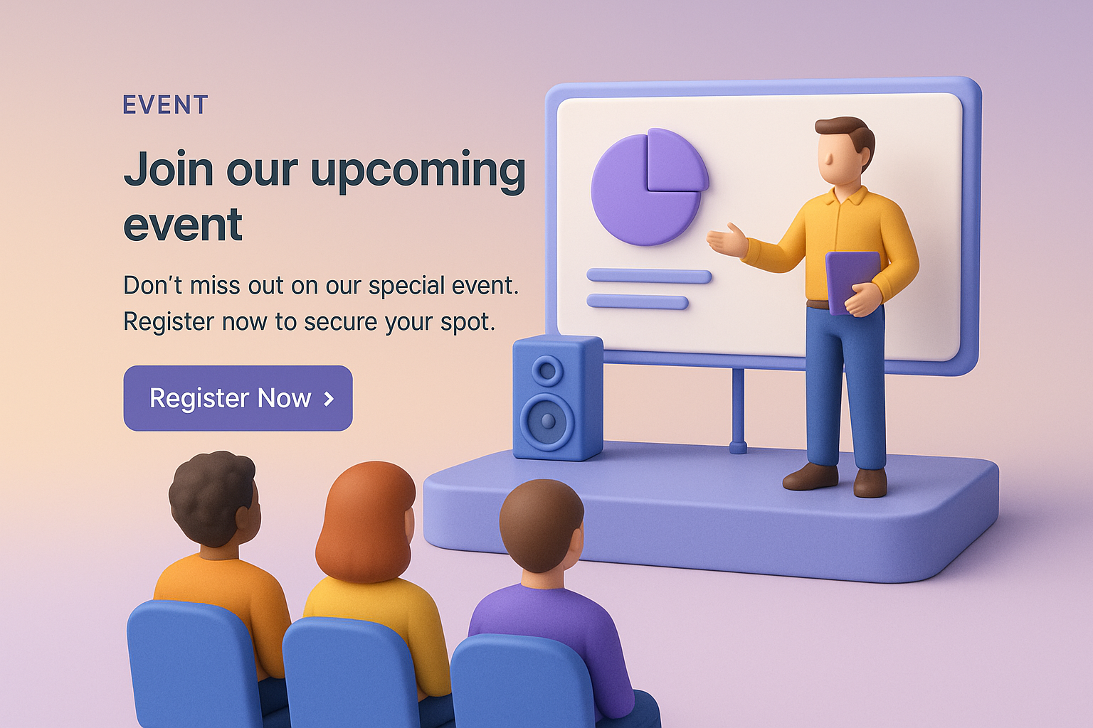 /Collection: /by davooda/Type: PNG/A detailed 3D illustration depicting a presenter in front of an audience, promoting an upcoming event. Features a screen with graphs and a call-to-action button.