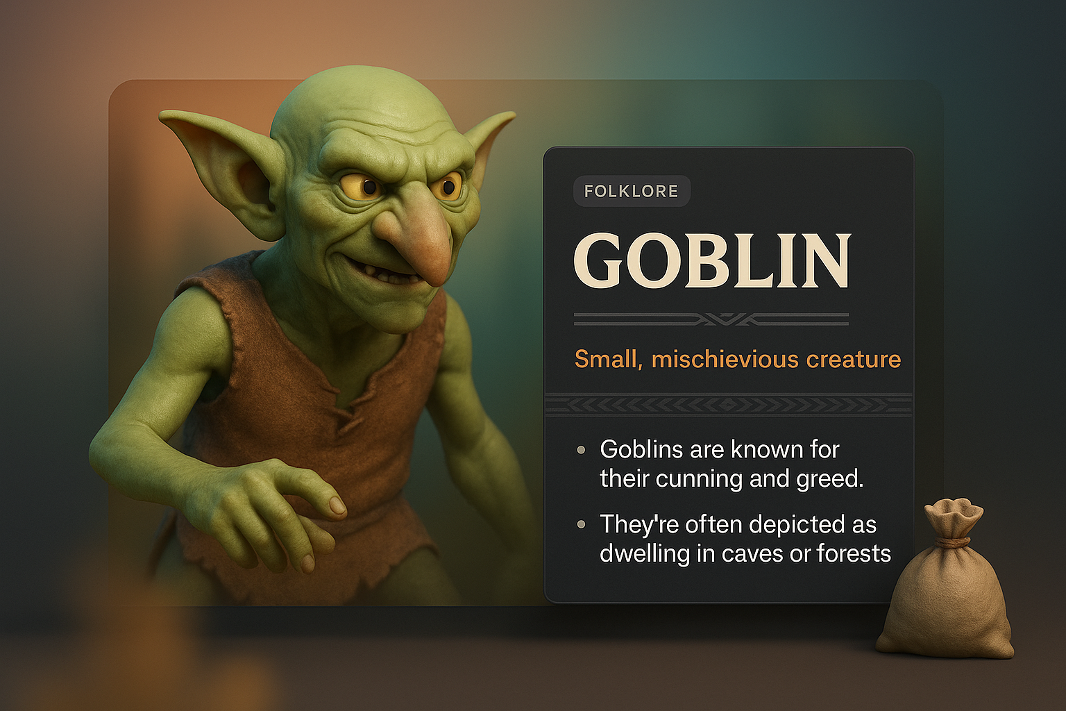 A detailed 3D illustration of a goblin, featuring a dark overlay with informative text. The goblin appears mischievous, set against a gradient background.