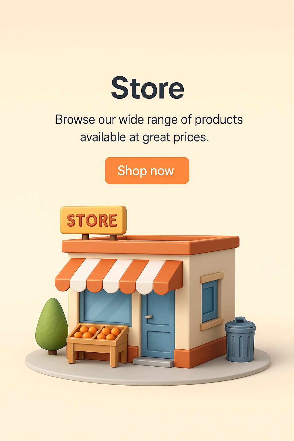/Collection: /by davooda/Type: PNG/A detailed 3D illustration of a store featuring a gradient background. The scene includes a shop with an orange and white awning, a fruit cart, and a trash bin, along with a clear call-to-action button.