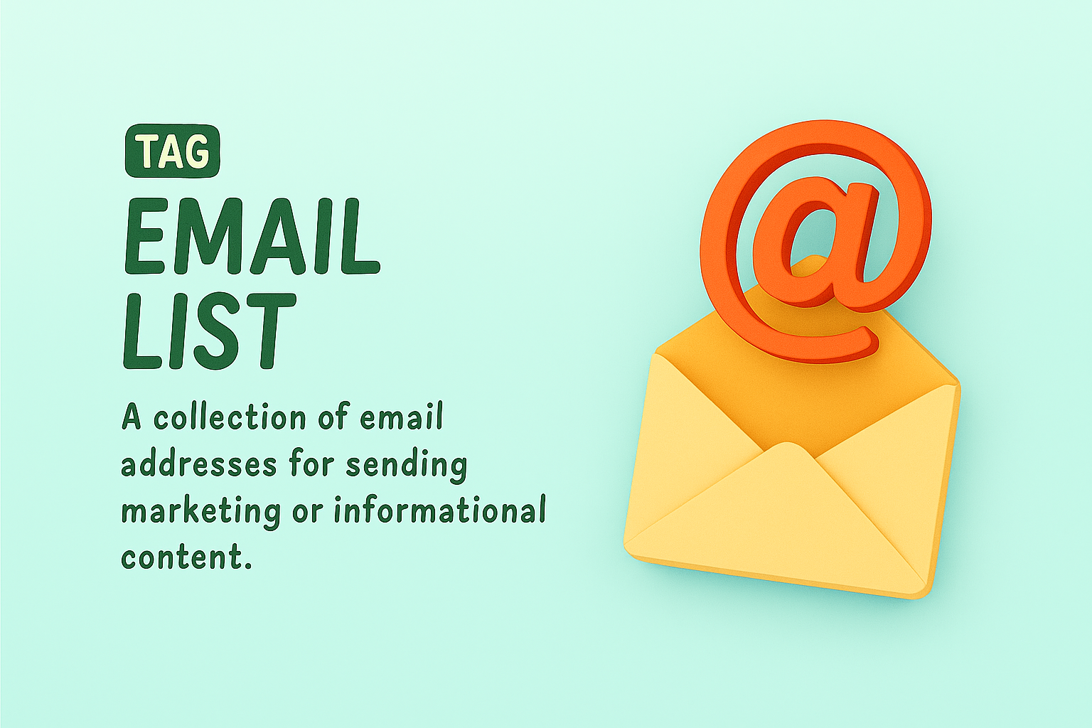 A visually appealing 3D graphic featuring an envelope and '@' symbol, representing the concept of an email list for marketing purposes. Ideal for digital marketing content.