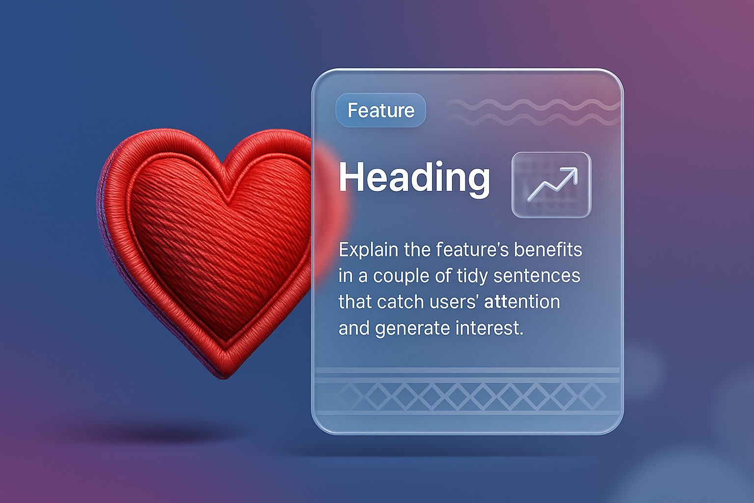 A vibrant 3D embroidered heart patch stands out against a smooth gradient background. Accompanying text box highlights features with a modern design.
