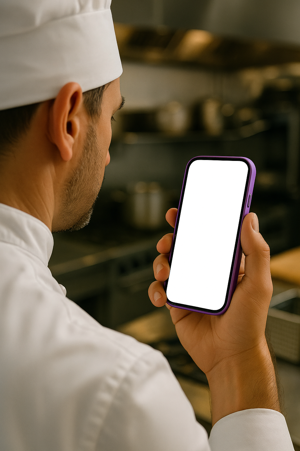 /Collection: /by davooda/Type: PNG/A chef in a white coat and hat is holding a purple phone with a blank screen in a kitchen setting. The image captures a dynamic view from behind the chef, emphasizing the phone.