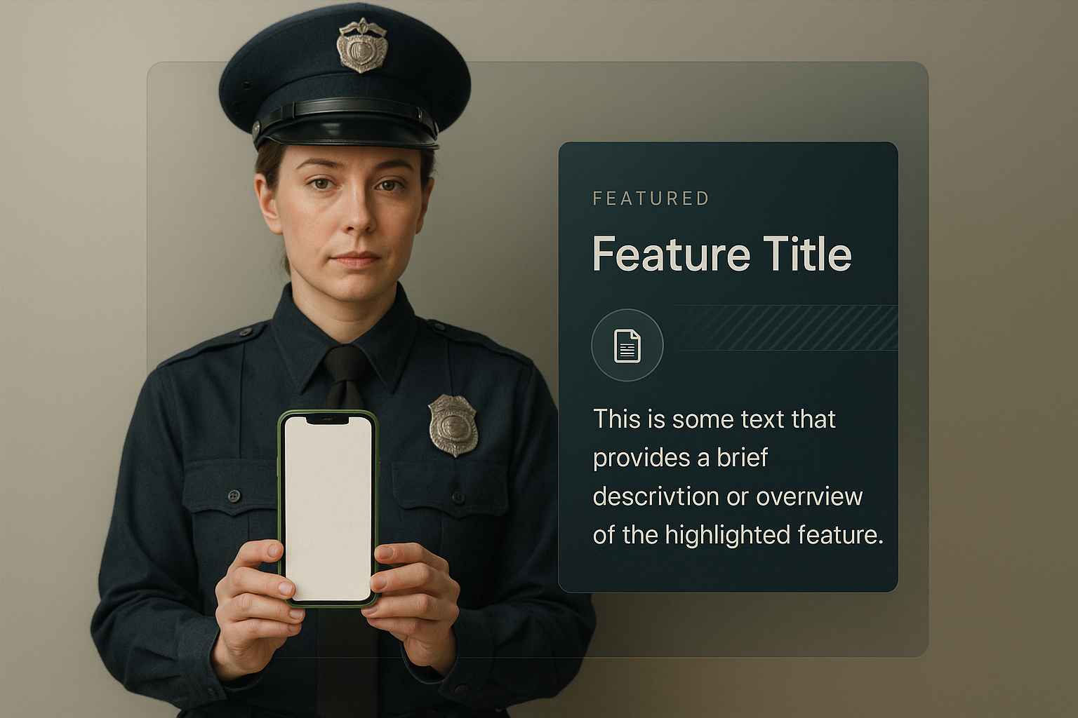A female police officer in uniform poses with a green phone, displaying a white screen. The background features a smooth gradient, enhancing the professional atmosphere.