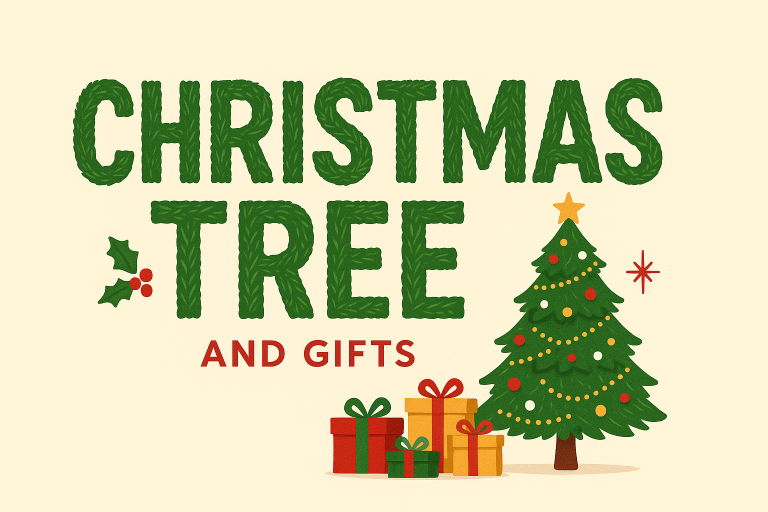 Festive Holiday Graphic Featuring Christmas Tree and Gifts