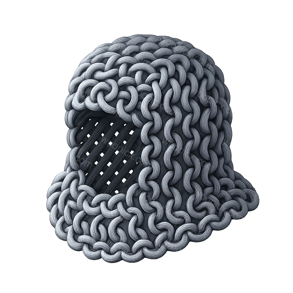 A stylized 3D icon of a chainmail helmet, featuring intricate woven metal links. The helmet design showcases a unique texture and structure, perfect for gaming or medieval themes.