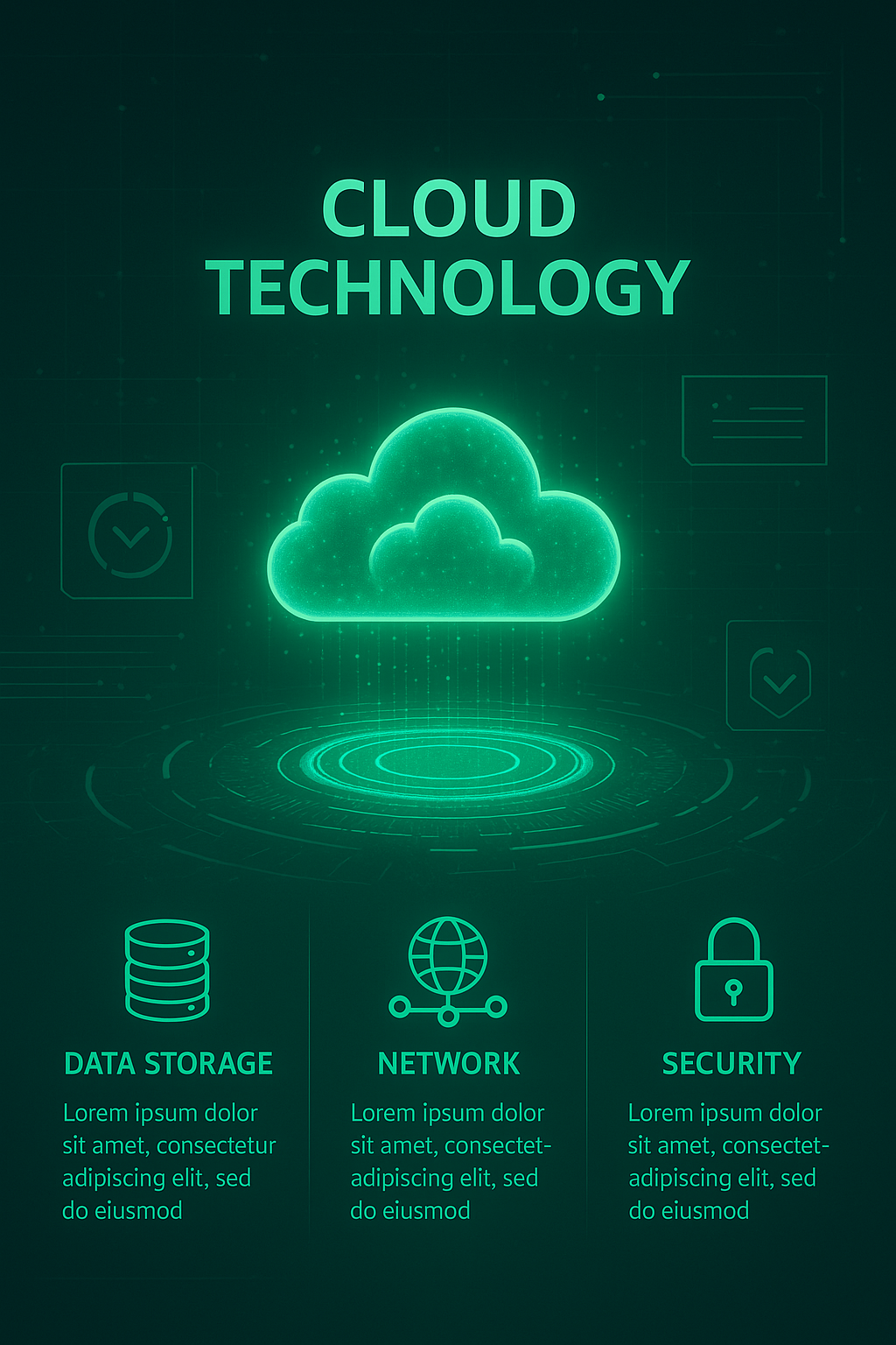Informative infographic showcasing cloud technology with glowing graphics, ideal for tech presentations and educational content.