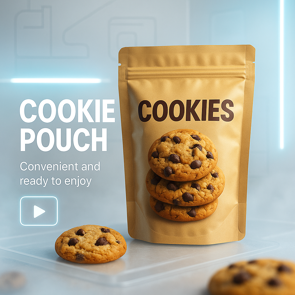 Realistic product packaging mockup showcasing a pouch of cookies, designed for marketing purposes with a modern aesthetic, ideal for e-commerce and food branding.