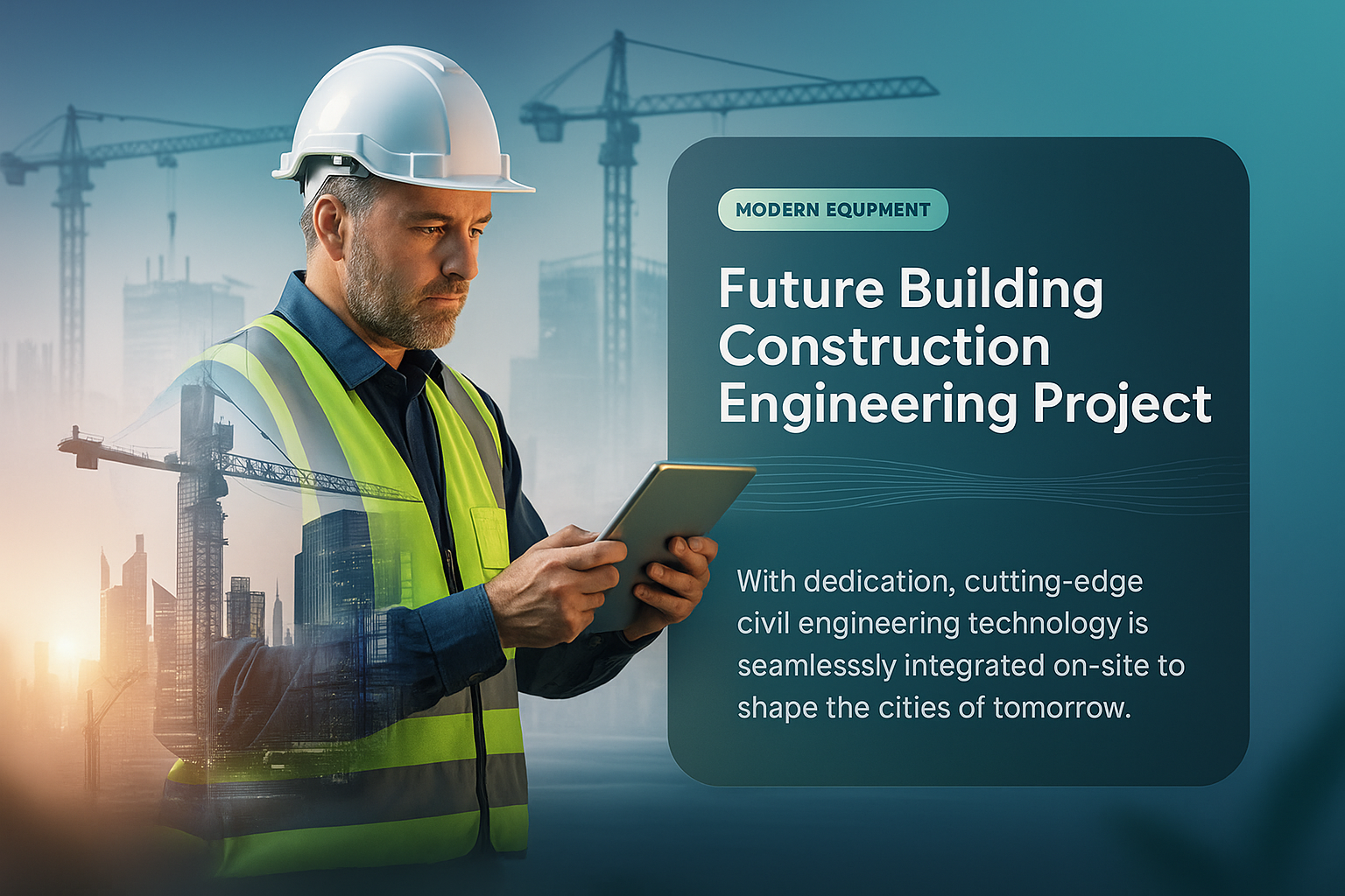 /Collection: /by davooda/Type: PNG/A focused engineer in a hard hat and safety vest uses a tablet on a construction site. The image showcases modern civil engineering with cranes and a gradient background, emphasizing innovation.