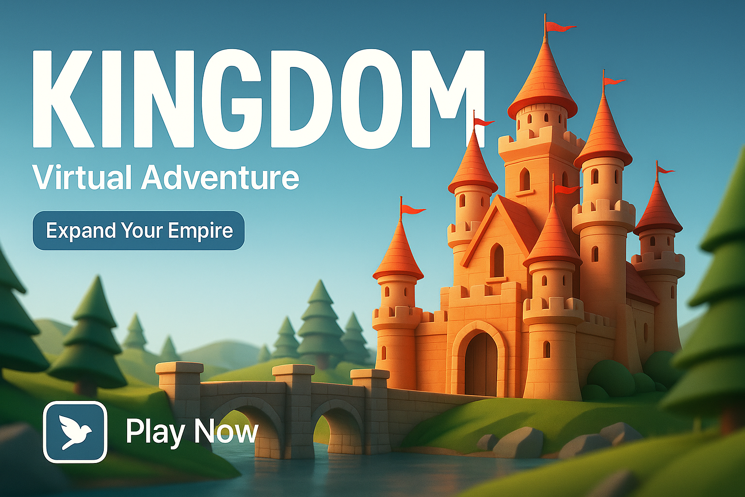/Collection: /by davooda/Type: PNG/A captivating 3D illustration of a kingdom featuring a castle with turrets, surrounded by trees and a bridge. The design includes bold text and vibrant colors, inviting players to explore.