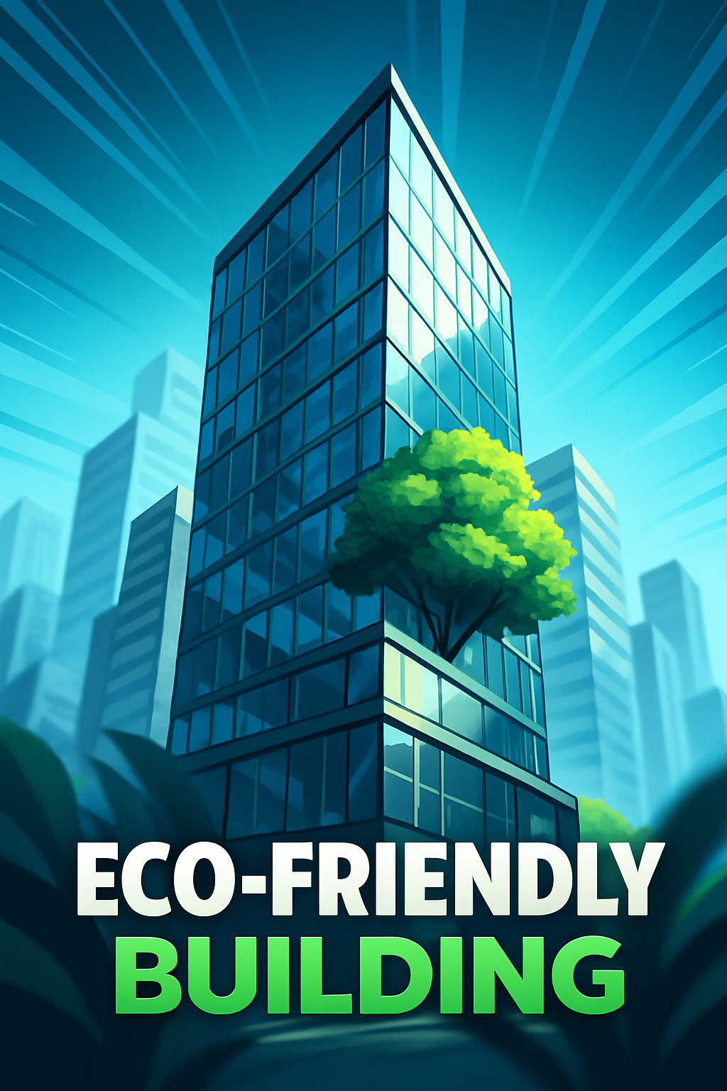 /Collection: /by davooda/Type: PNG/A sleek, modern glass office building surrounded by a vibrant urban landscape, featuring a prominent tree for carbon reduction. The dynamic composition emphasizes sustainability.