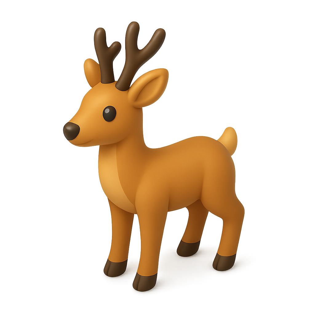 A cute, stylized 3D icon of a roe deer, presented in a three-quarter view with a soft, volumetric design. The deer features antlers and a warm, inviting color palette.