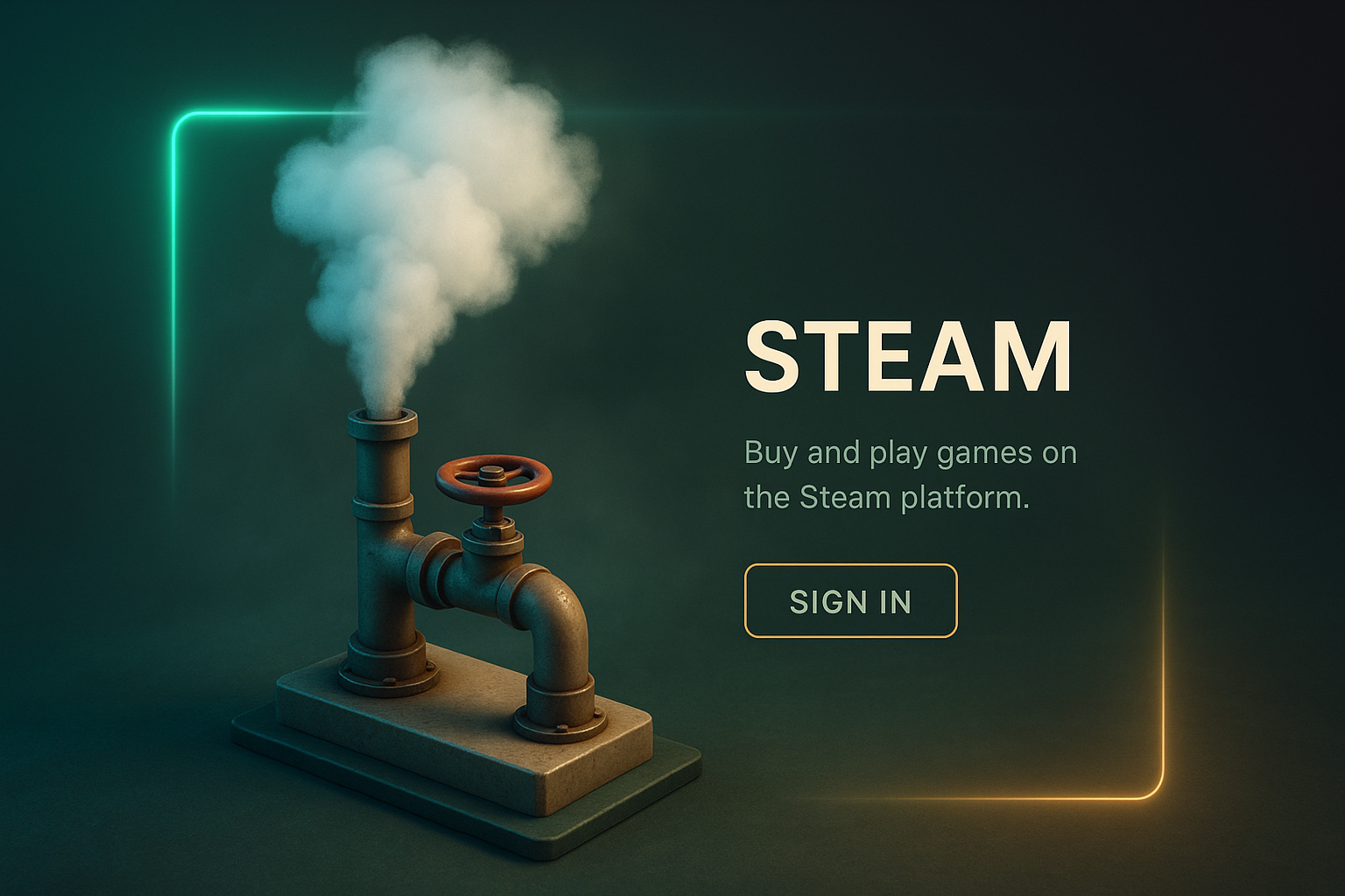 /Collection: /by davooda/Type: PNG/A captivating 3D scene featuring a steam pipe with smoke, illuminated by neon accents. The design includes a sign-in button and text block, all set against a dark gradient background.