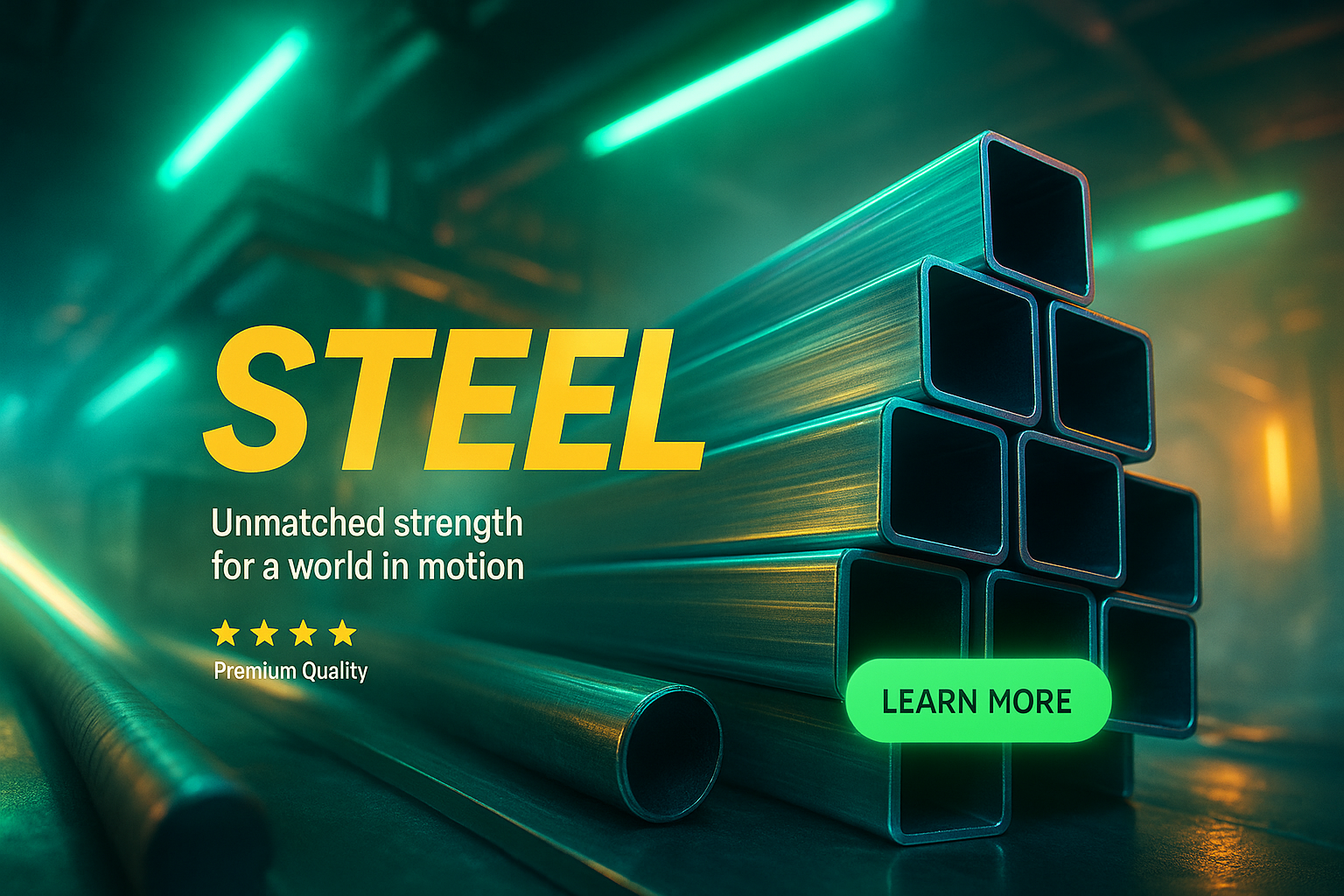 A striking advertisement showcasing steel pipes with neon accents and a blurred background, emphasizing unmatched strength and quality in a motion-filled world.