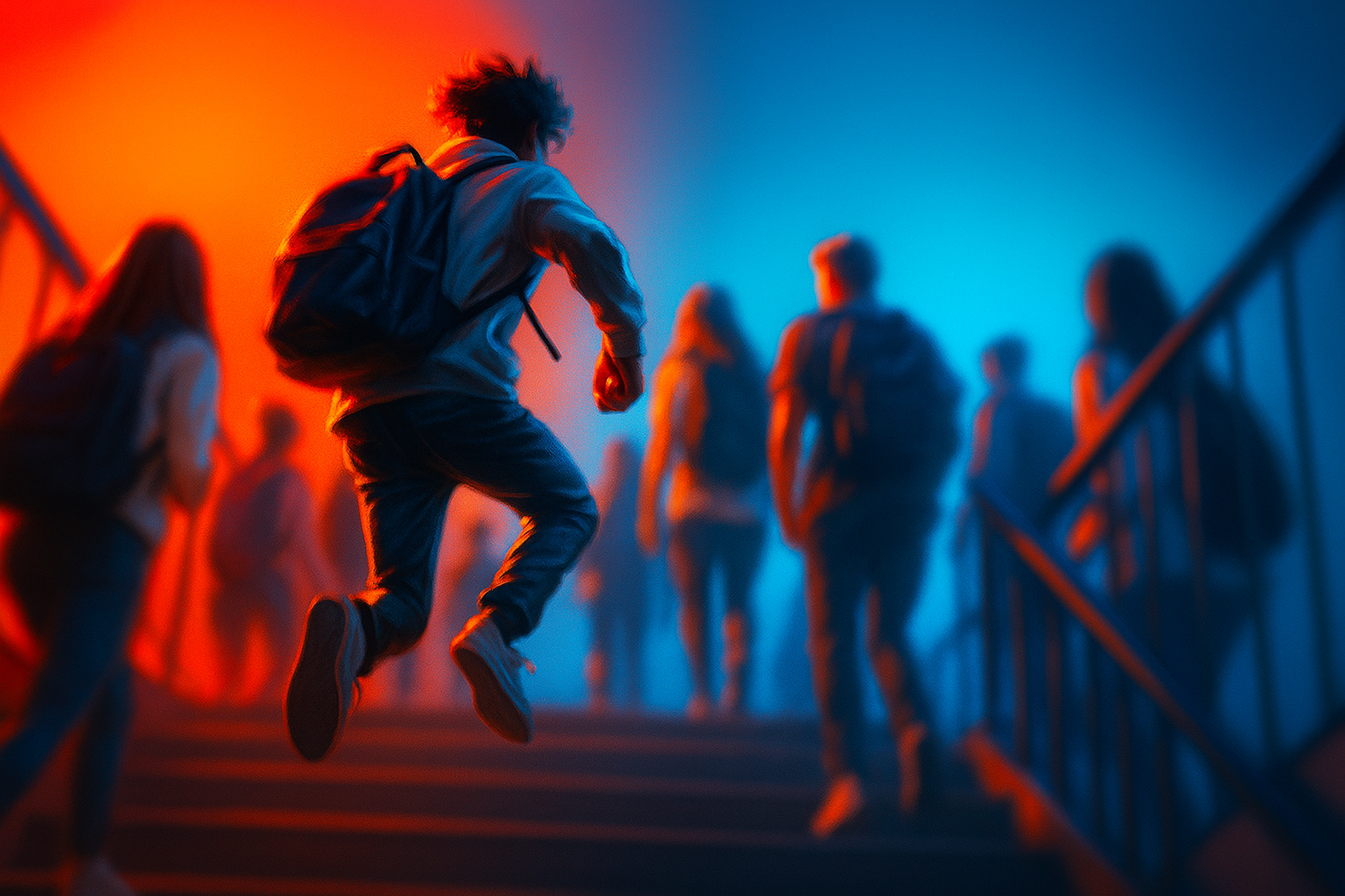 /Collection: /by davooda/Type: PNG/A blurred shot captures high school students energetically ascending stairs between classes. The dynamic angle emphasizes movement, with striking contrasting colors illuminating the scene from both sides.