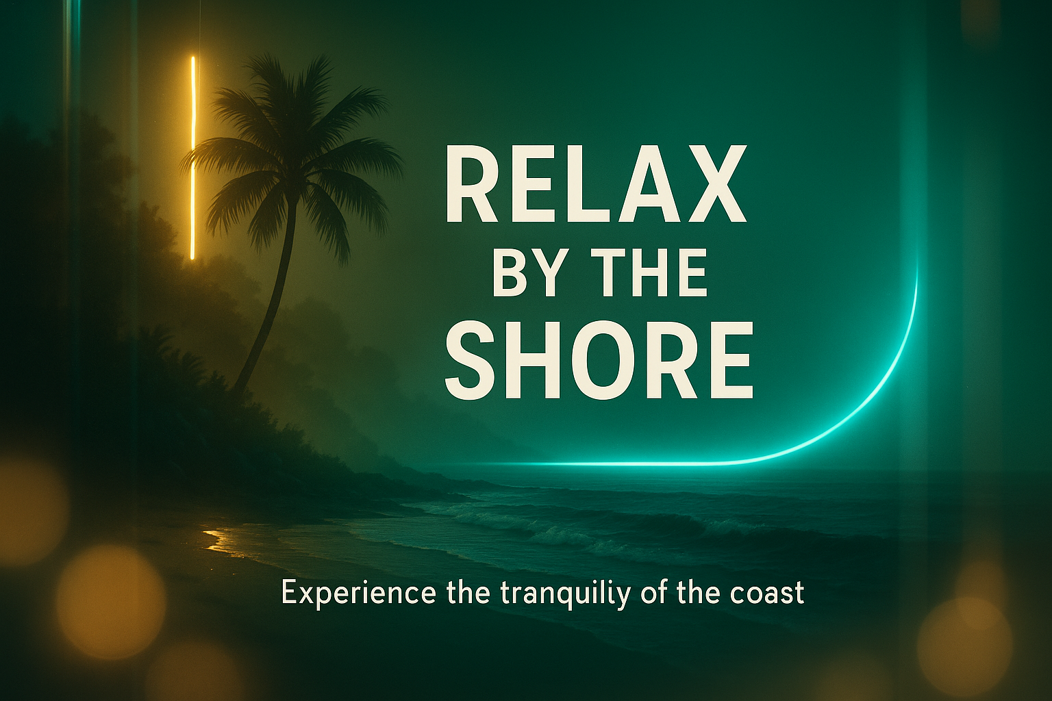 A serene coastal scene featuring neon accents and a misty atmosphere, showcasing palm trees and glowing lights. The text invites viewers to relax by the shore.