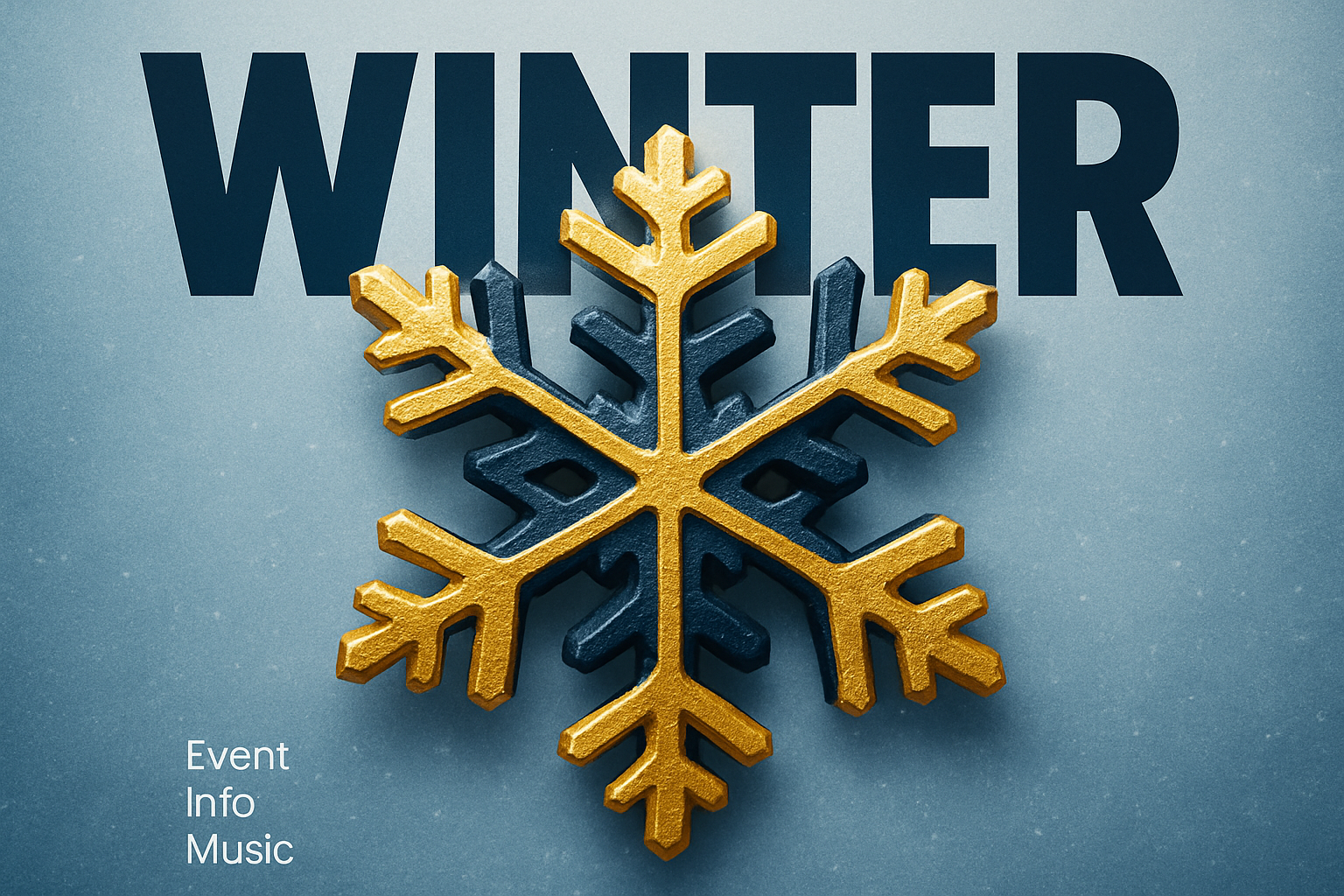 /Collection: /by davooda/Type: PNG/A striking winter-themed background featuring a large, realistic gold and navy snowflake in 3D. The snowflake overlaps bold sans-serif text, creating a modern, cinematic feel.