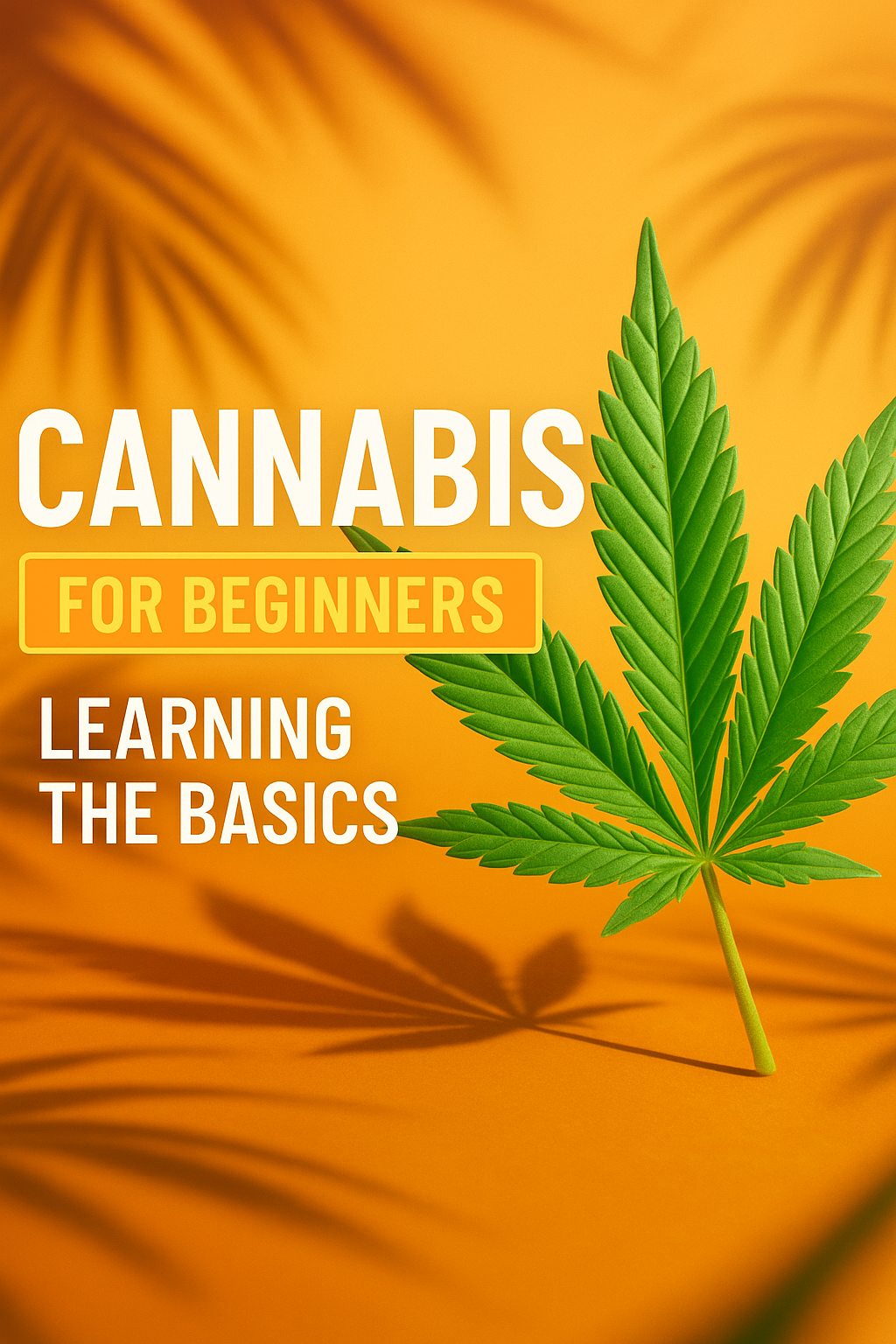 /Collection: /by davooda/Type: PNG/Vibrant educational image featuring a cannabis leaf against an orange background, designed to introduce beginners to cannabis concepts. Ideal for digital learning materials.