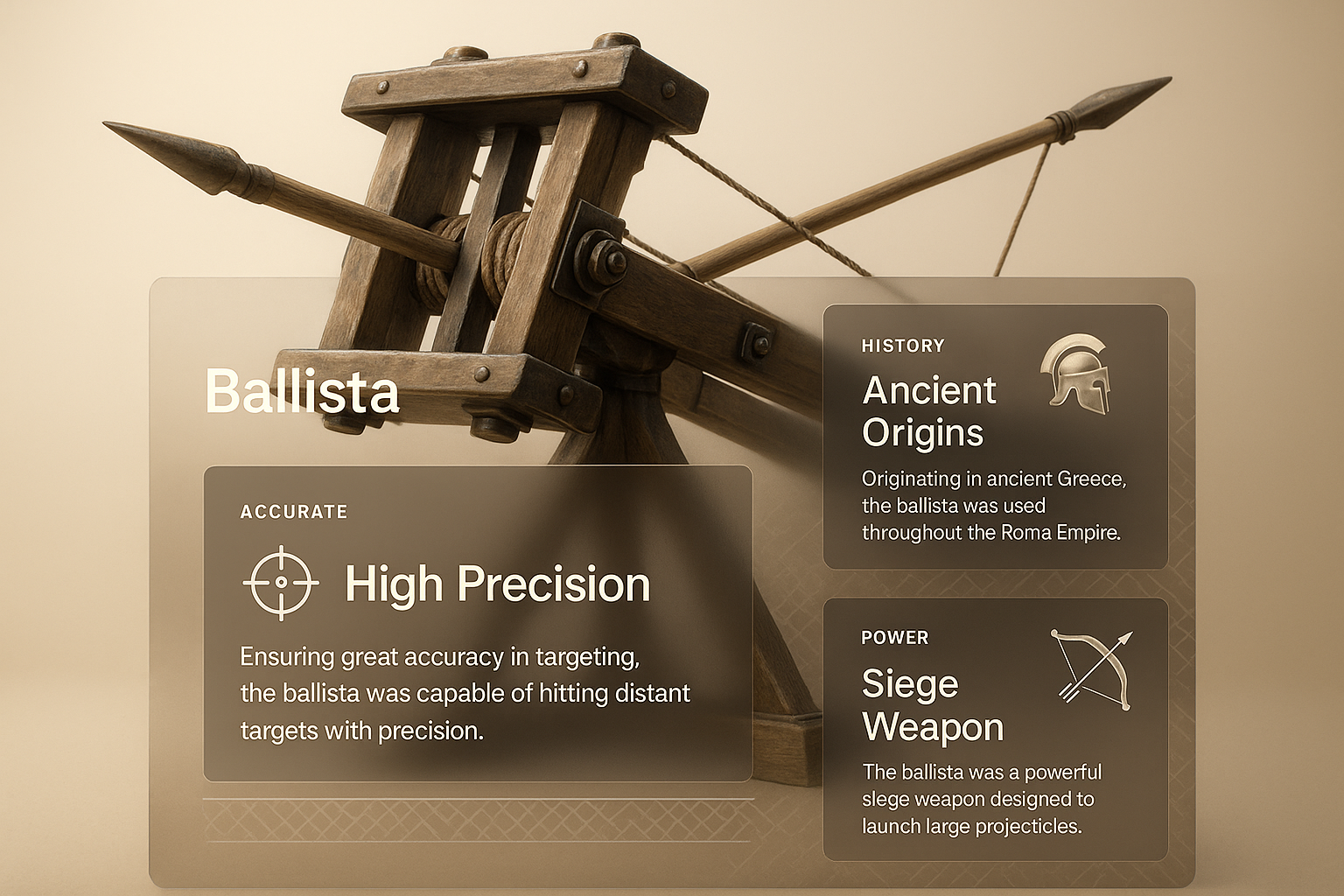 /Collection: /by davooda/Type: PNG/A sophisticated illustration of a ballista, enhanced with a transparent overlay. The design features informative blocks detailing its history, accuracy, and power, creating a stylish and cohesive visual.