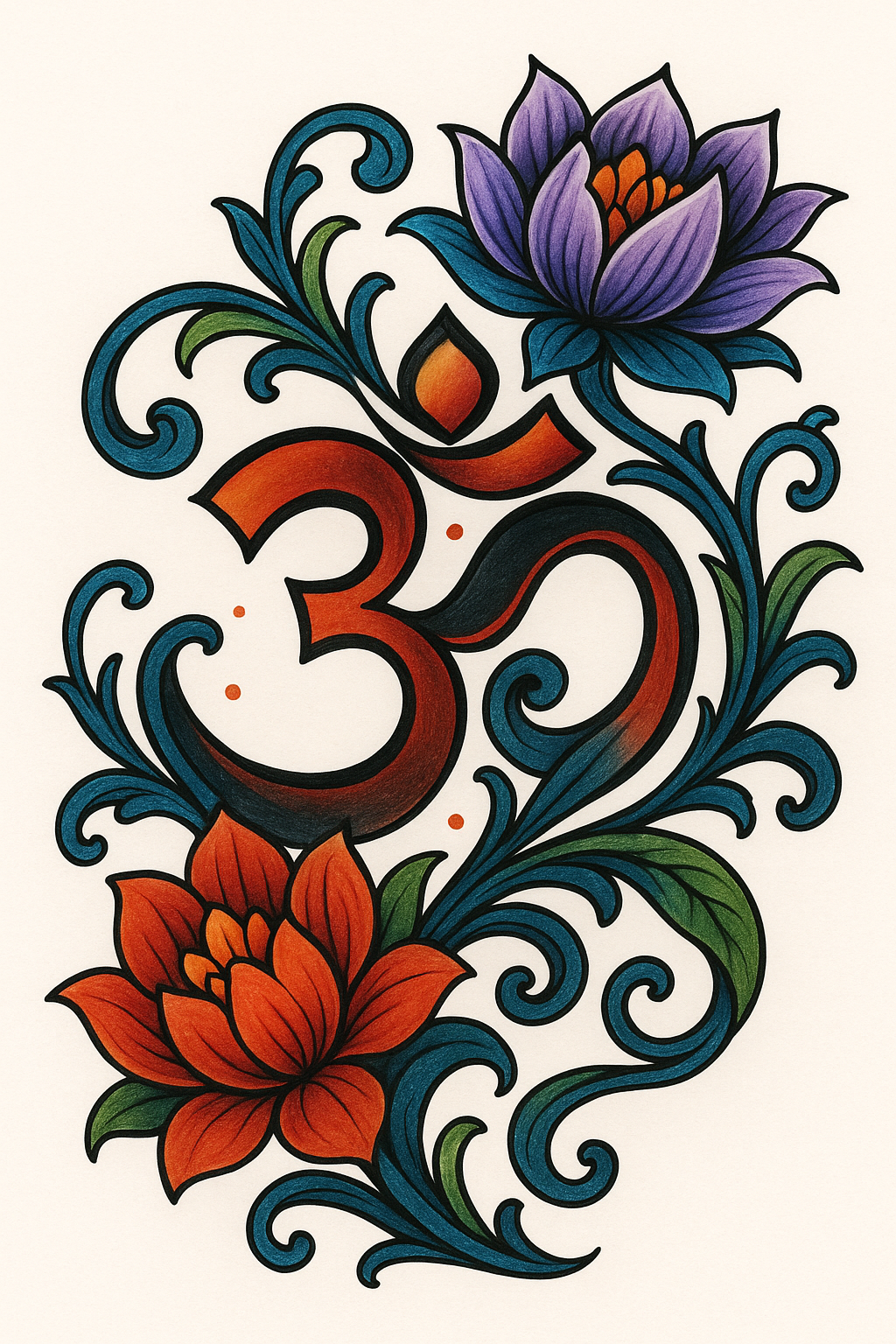 Vibrant illustration featuring the Om symbol surrounded by intricate floral designs, ideal for spiritual or artistic themes in decor or print.