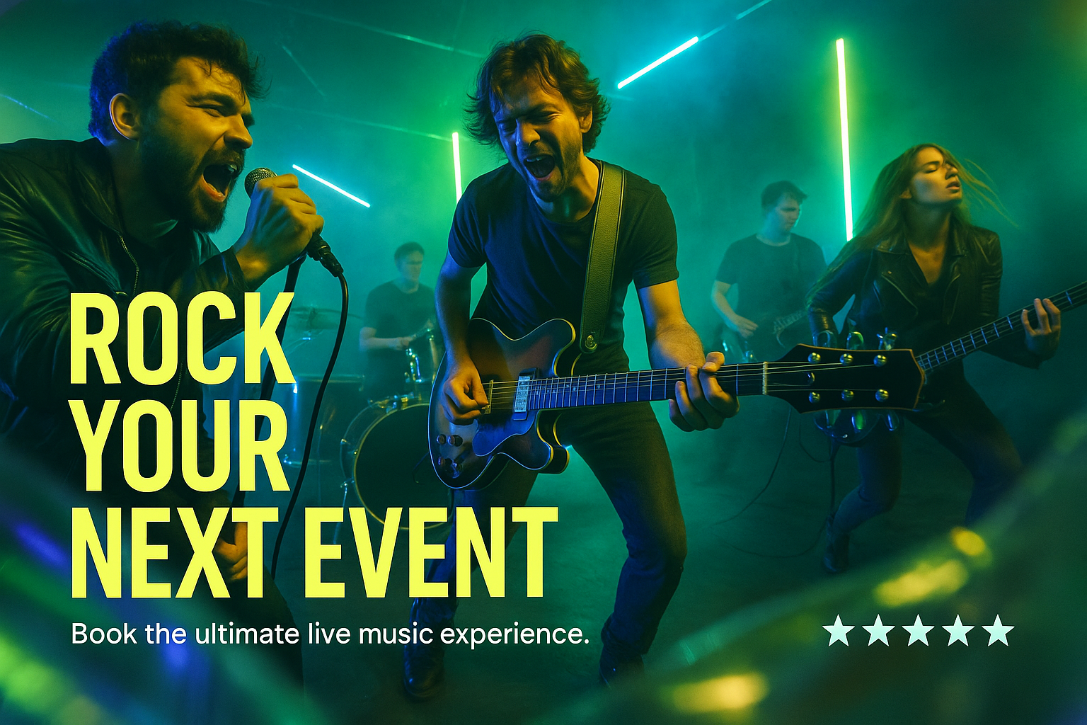 A vibrant scene showcasing a band performing live under neon lights. The dynamic atmosphere is enhanced by glowing accents and a professional layout promoting an event.