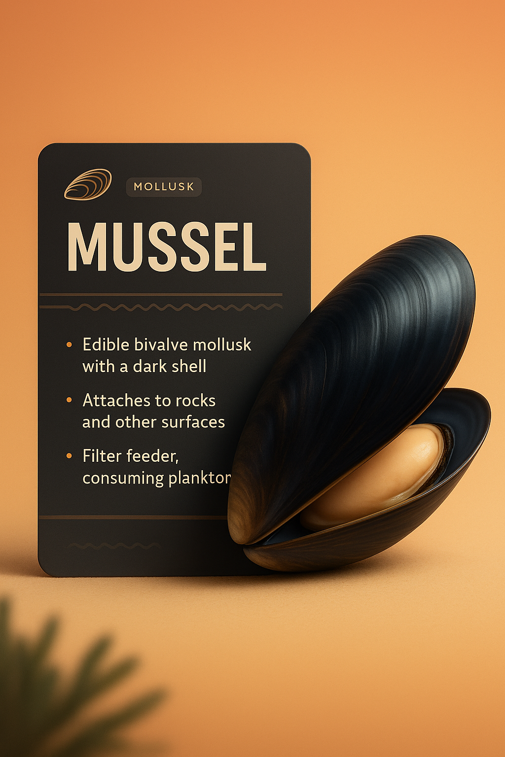 A realistic 3D illustration of a mussel with a dark shell, accompanied by a stylish label. The background features a smooth gradient, enhancing the visual appeal.