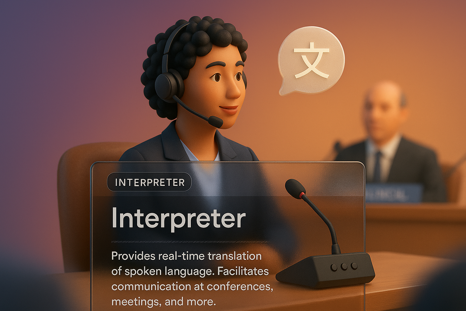 A 3D illustration of an interpreter at work, featuring a clear background and a modern design. The image showcases a speech bubble and a text block detailing the interpreter's role.