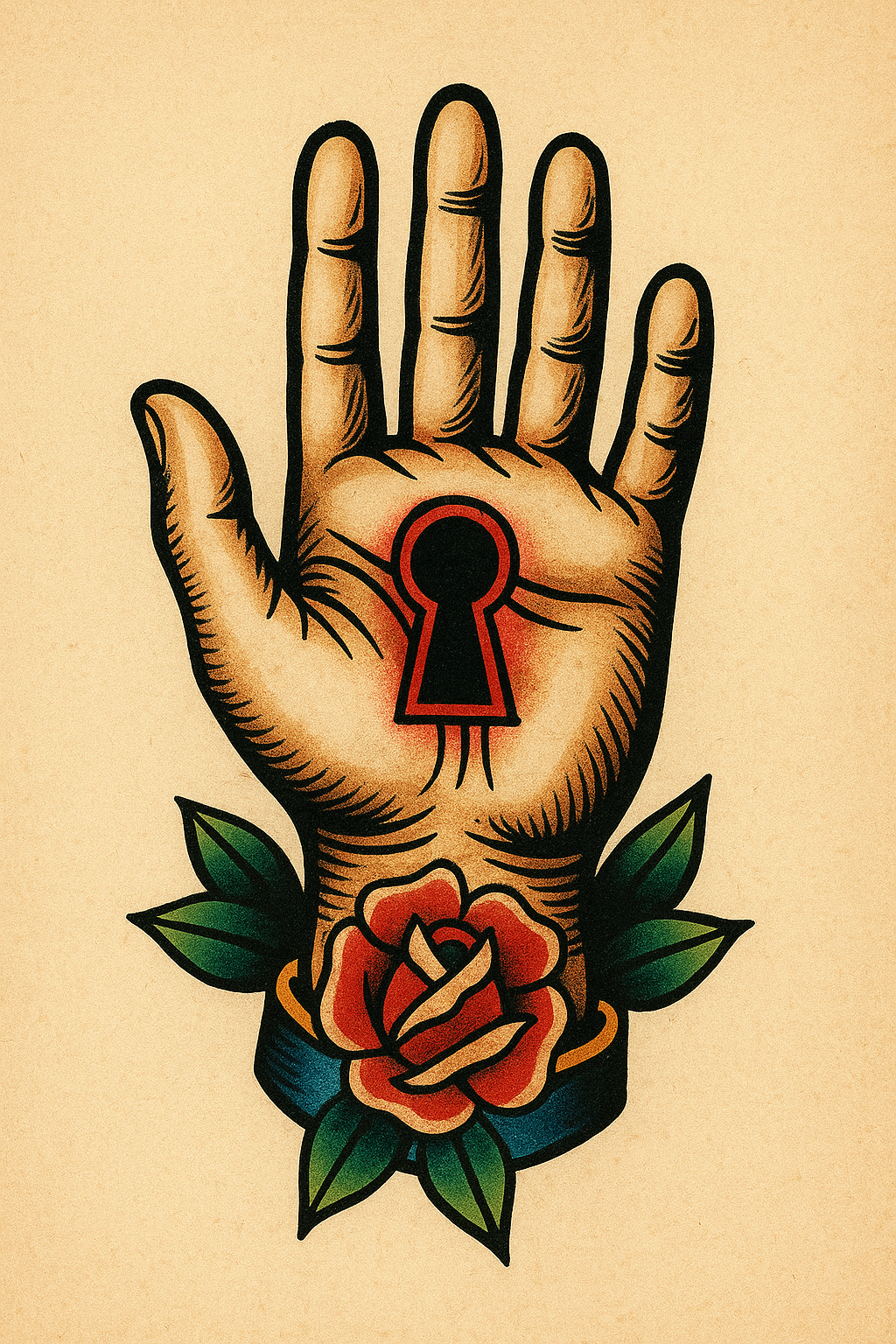 A detailed tattoo design featuring a keyhole in the palm of a hand, surrounded by a rose and green leaves. The artwork is on a light beige background, showcasing classic tattoo artistry.