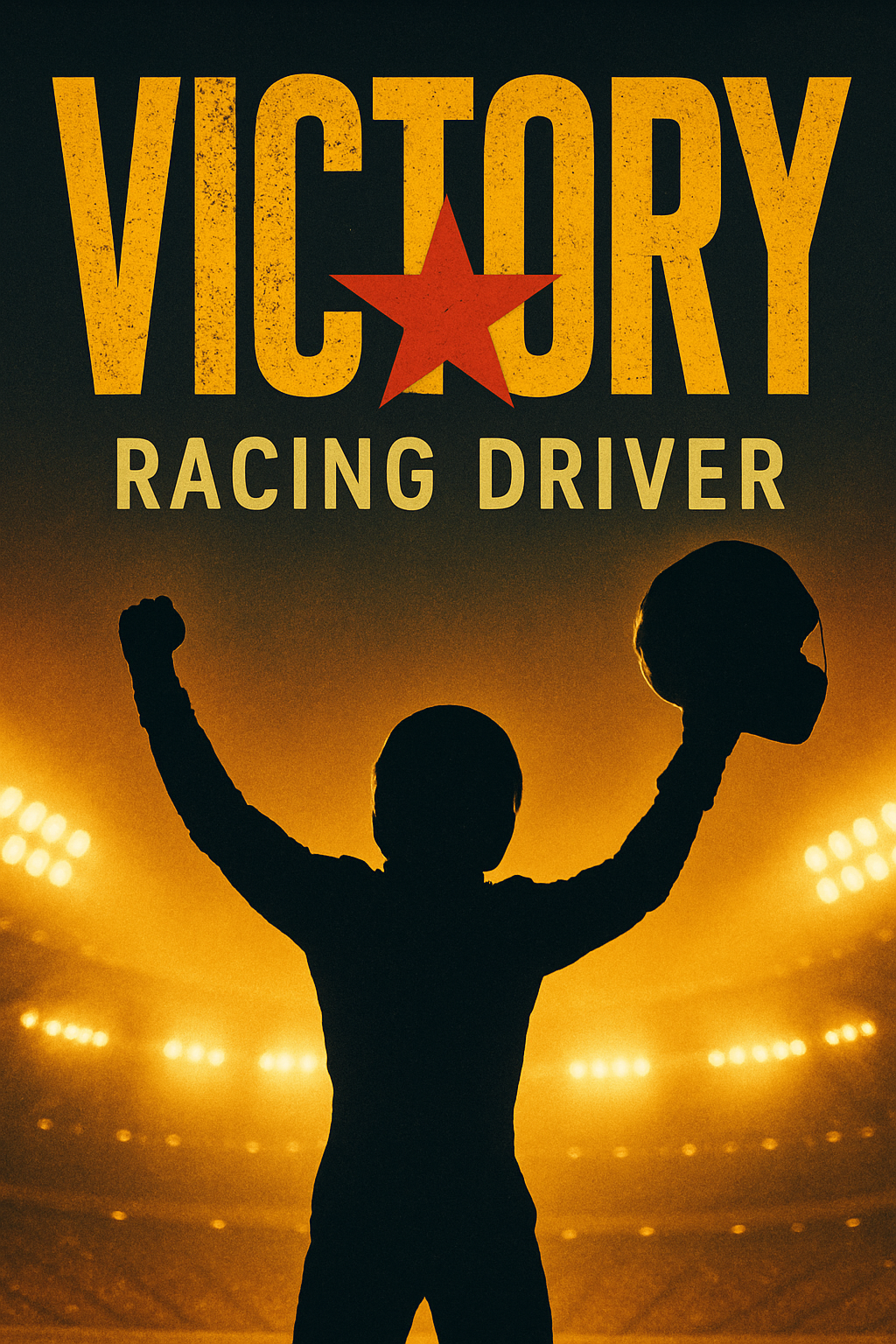 /Collection: /by davooda/Type: PNG/Dynamic poster featuring the silhouette of a racing driver celebrating victory, set against a dramatic background. Ideal for motorsport promotions or event marketing.