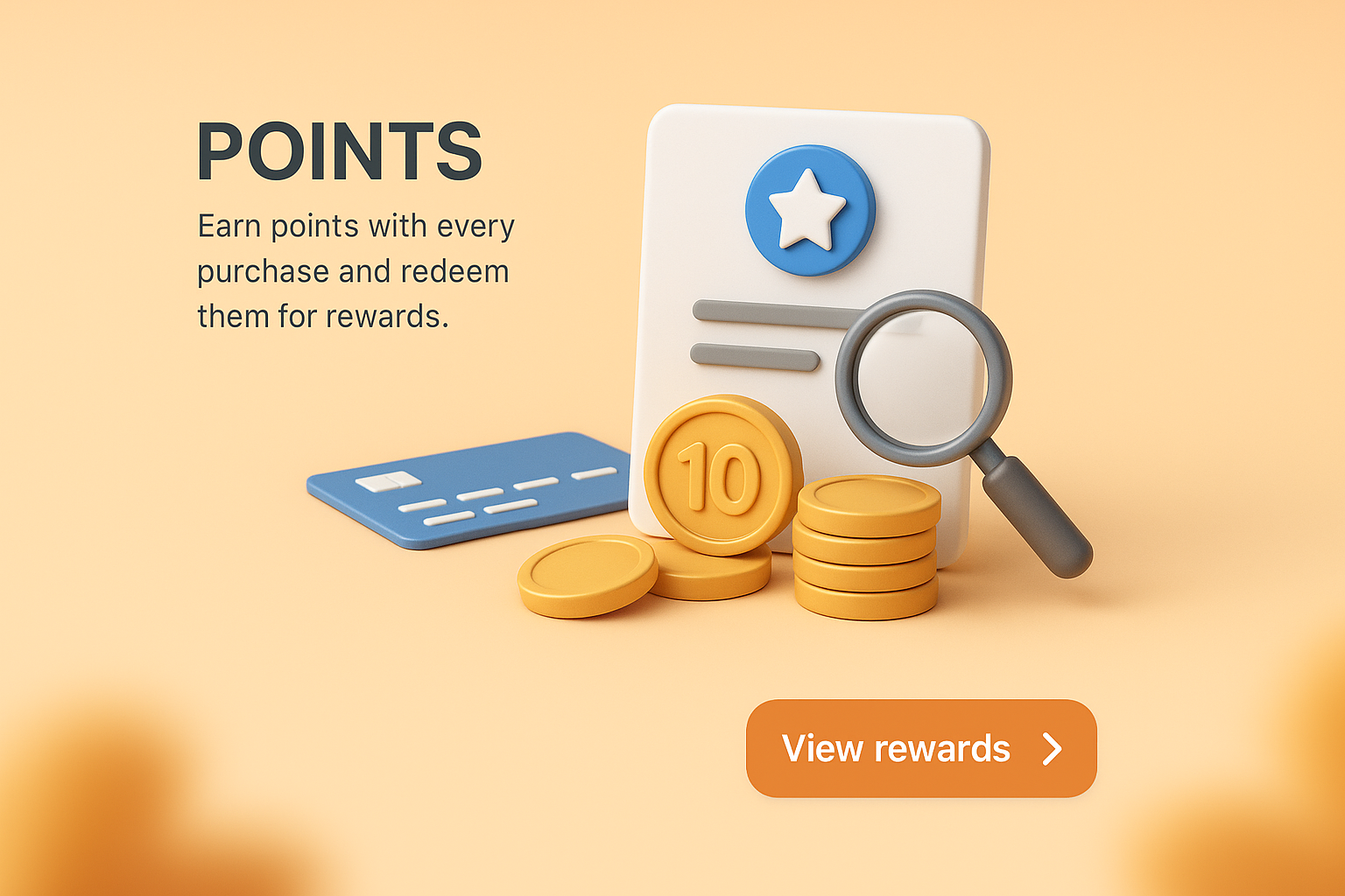 A detailed 3D illustration showcasing a points rewards system. It features coins, a magnifying glass, and a card, set against a smooth gradient background.