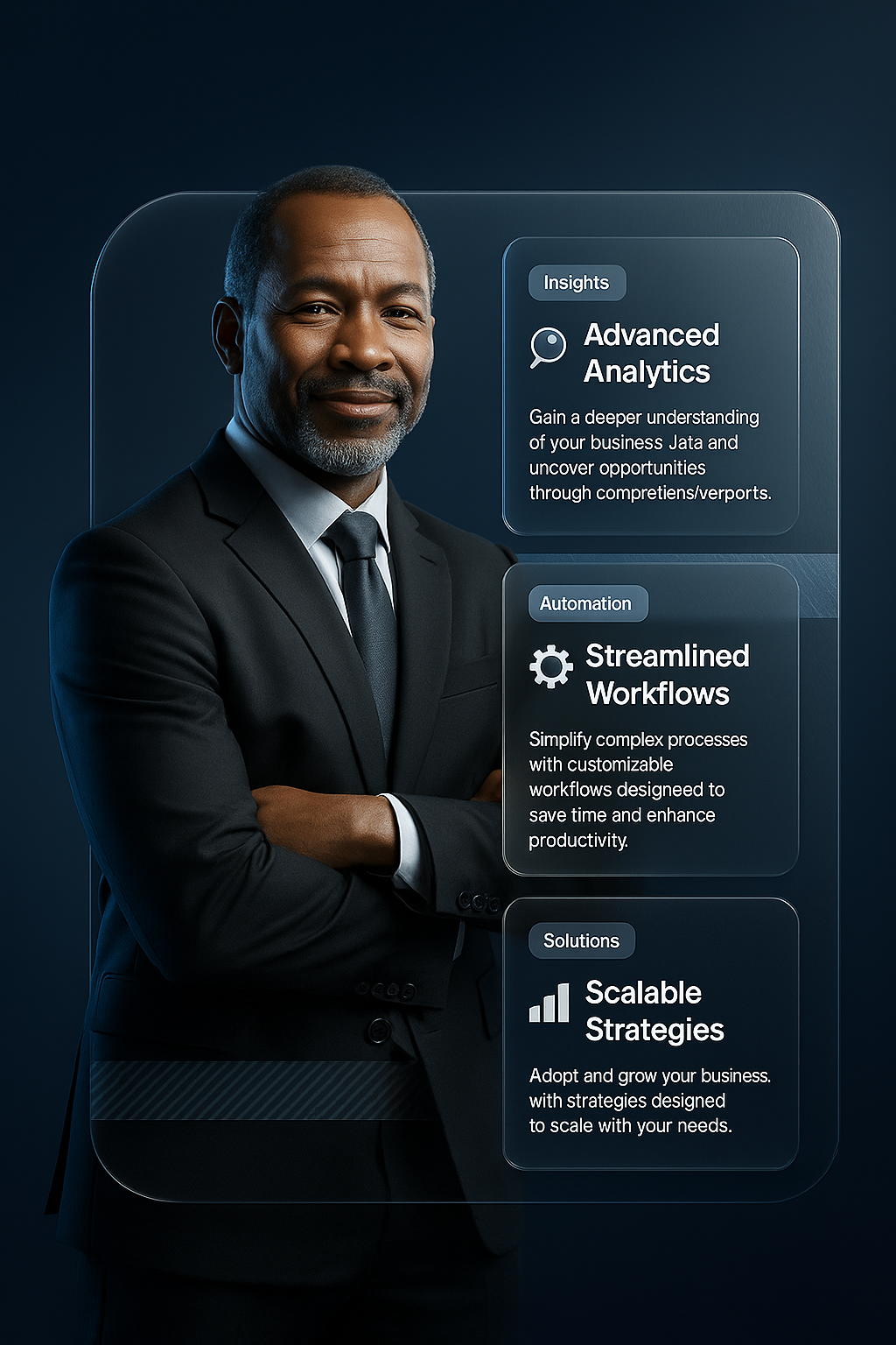 /Collection: /by davooda/Type: PNG/A mature businessman in a suit stands confidently with arms crossed, set against a sleek gradient background. The image features transparent overlay blocks highlighting key business insights and strategies.