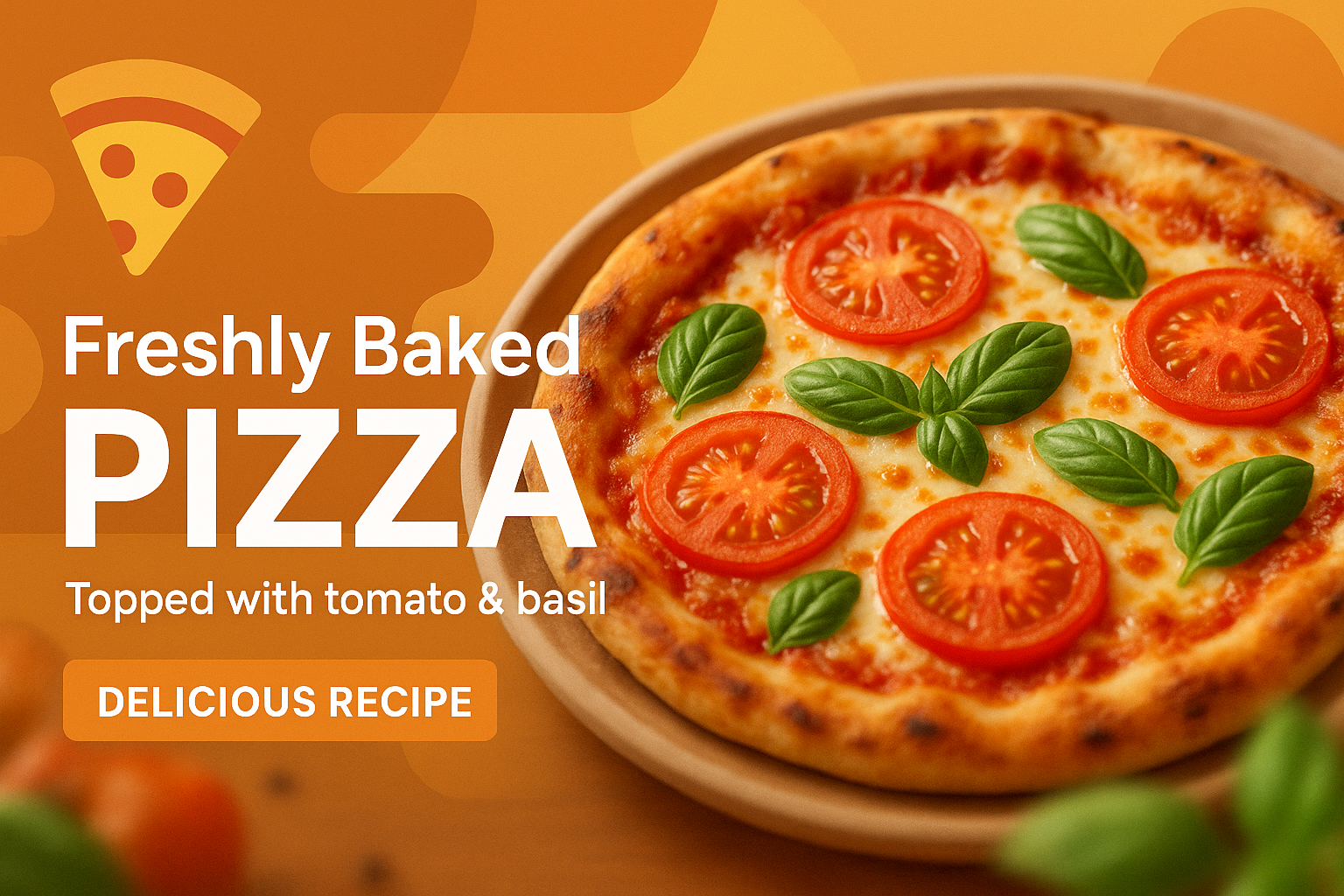 Vibrant promotional graphic showcasing a freshly baked pizza topped with tomatoes and basil. Ideal for food blogs, recipe websites, or culinary social media posts.