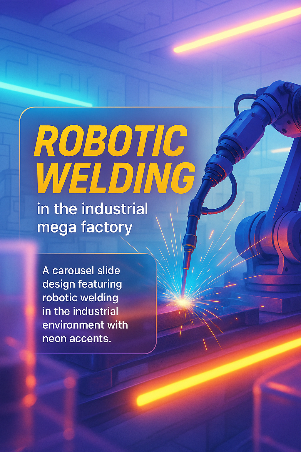 Vibrant digital illustration showcasing robotic welding in an industrial environment, enhanced with neon accents. Ideal for tech or industrial presentations.
