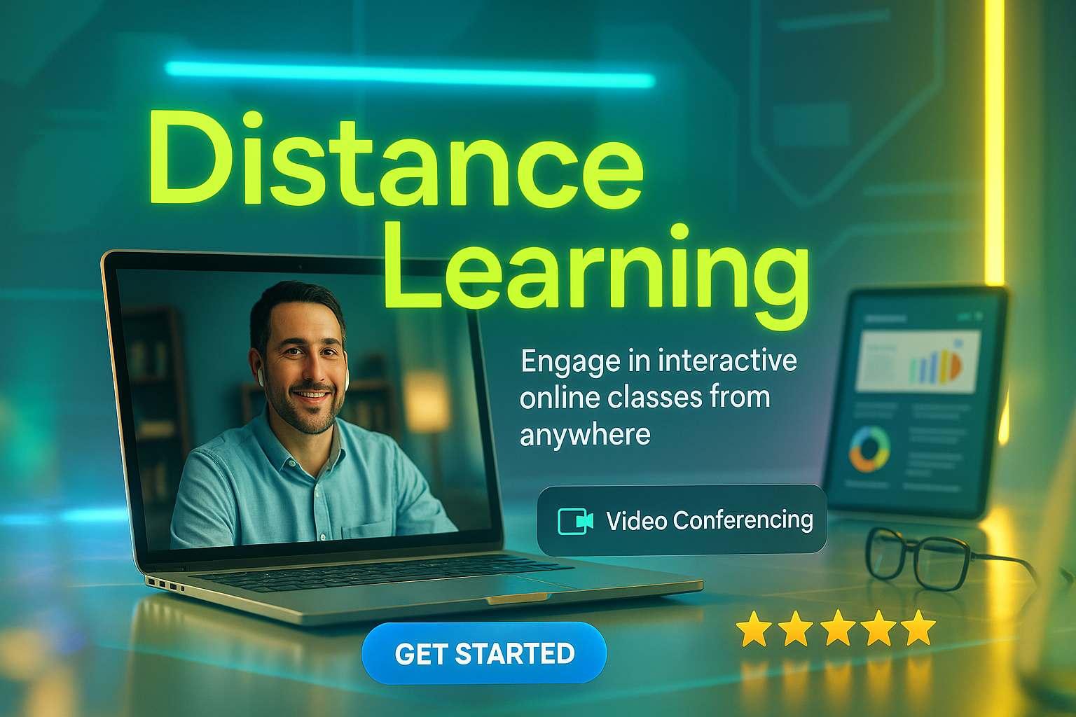 Engaging promotional graphic for distance learning featuring a smiling instructor on a laptop screen. Ideal for online education platforms and marketing campaigns.