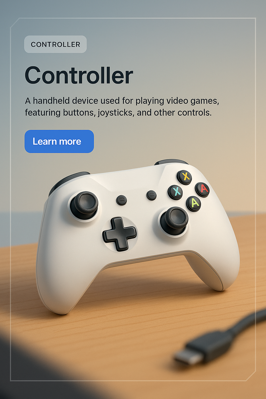 /Collection: /by davooda/Type: PNG/A realistic 3D illustration of a gaming controller on a wooden surface. The design includes buttons, joysticks, and a charging cable, set against a smooth gradient background.