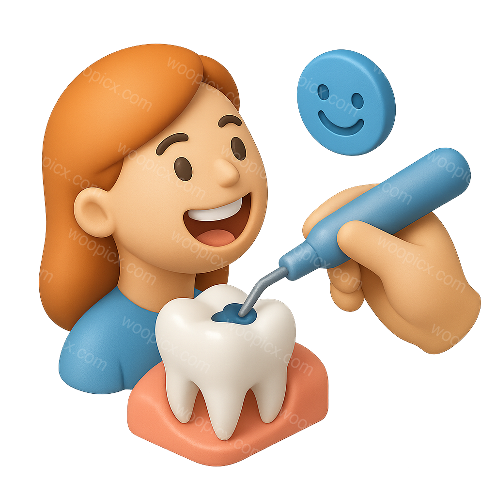 /Premium/Collection: /by davooda/Type: PNG/A colorful 3D icon depicting a dental scene where a smiling character receives a painless filling. The scene includes a hand holding a dental tool, emphasizing a friendly atmosphere.