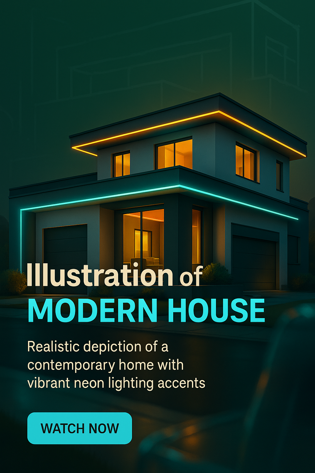 /Collection: /by davooda/Type: PNG/A striking digital illustration showcasing a contemporary home illuminated with vibrant neon accents, ideal for architectural presentations or real estate marketing.