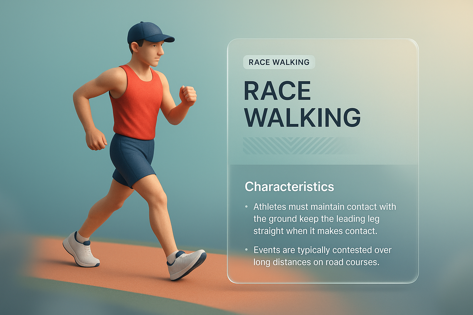 /Collection: /by davooda/Type: PNG/A 3D illustration depicting a race walker in motion, accompanied by a transparent info panel detailing race walking characteristics. The background features a smooth gradient.