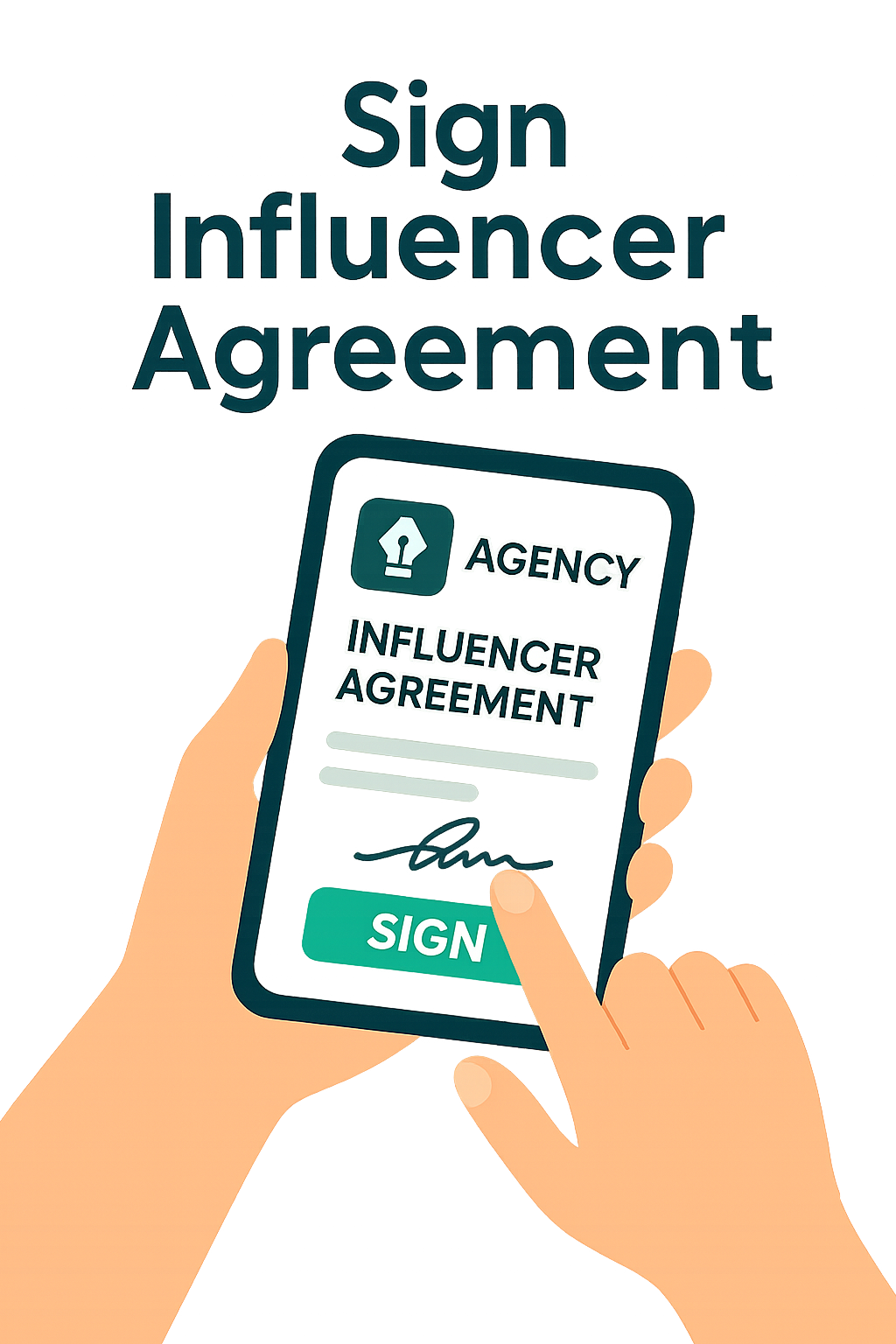 Illustrative graphic depicting a smartphone displaying an influencer agreement, conveying a modern digital signing process. Ideal for marketing or legal contexts.