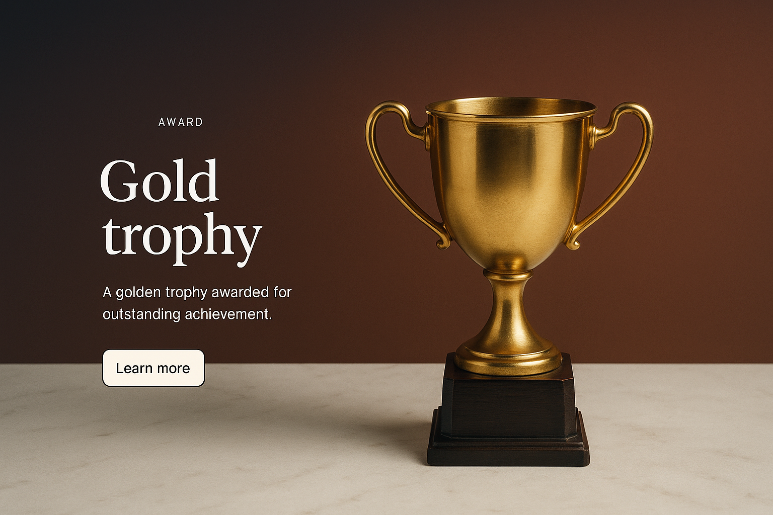 /Collection: /by davooda/Type: PNG/A beautifully styled gold trophy displayed on a marble surface, symbolizing achievement. The gradient background enhances its elegance, complemented by a clear text block and action button.