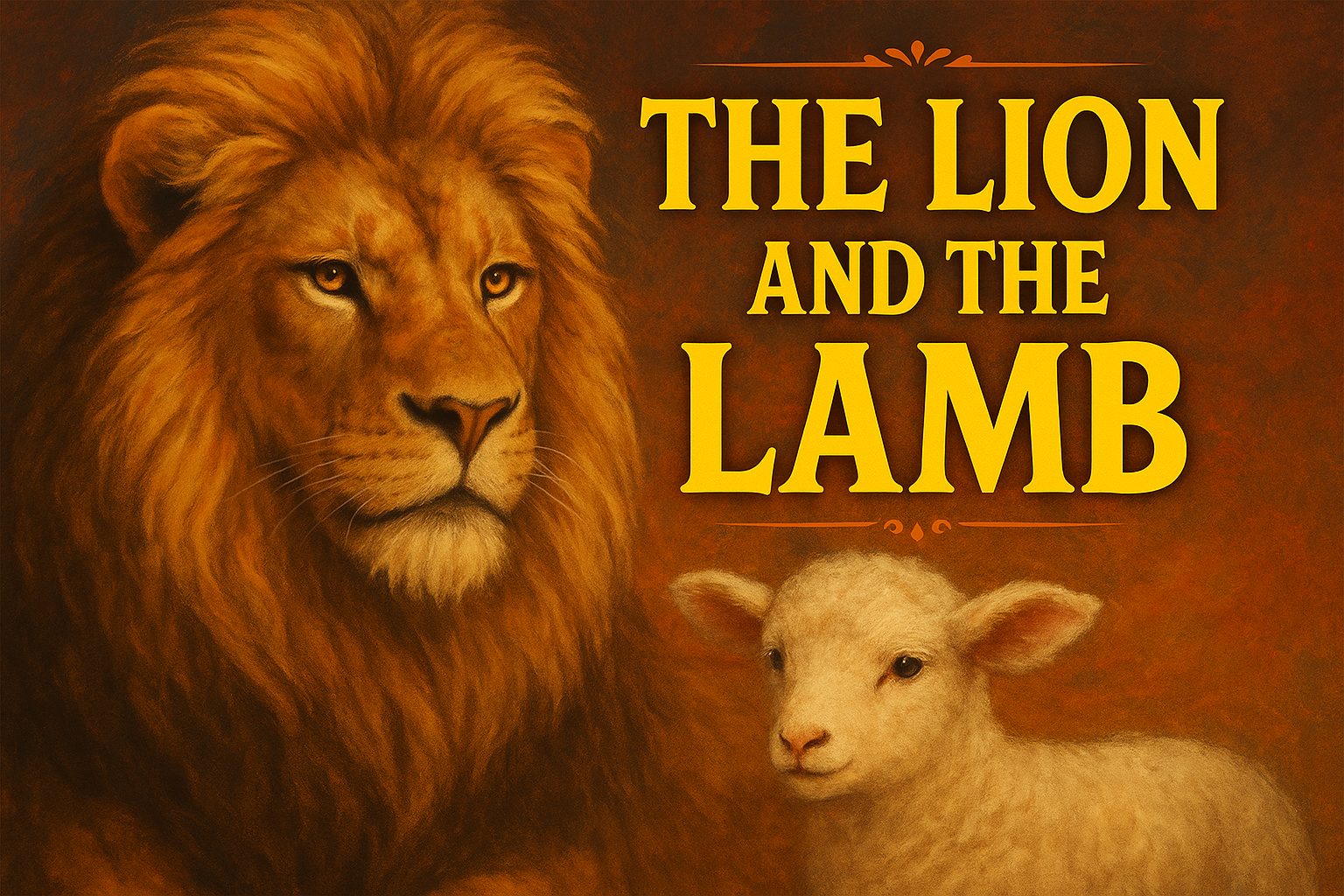A visually striking illustration featuring a lion and a lamb, symbolizing peace and harmony, ideal for religious or inspirational themes.