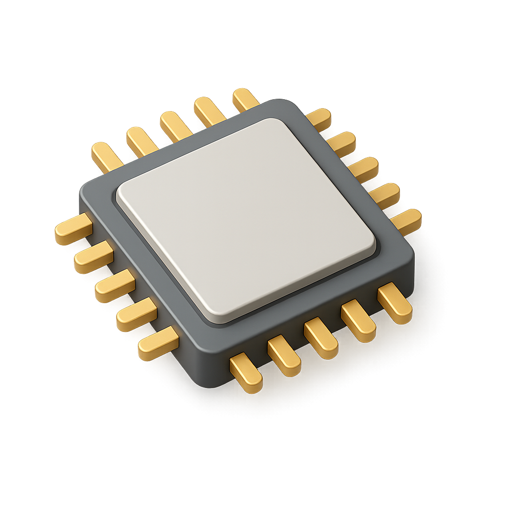 A sleek 3D isometric CPU icon featuring a central square chip with golden pins, set against a soft gradient background, emphasizing depth and volume.