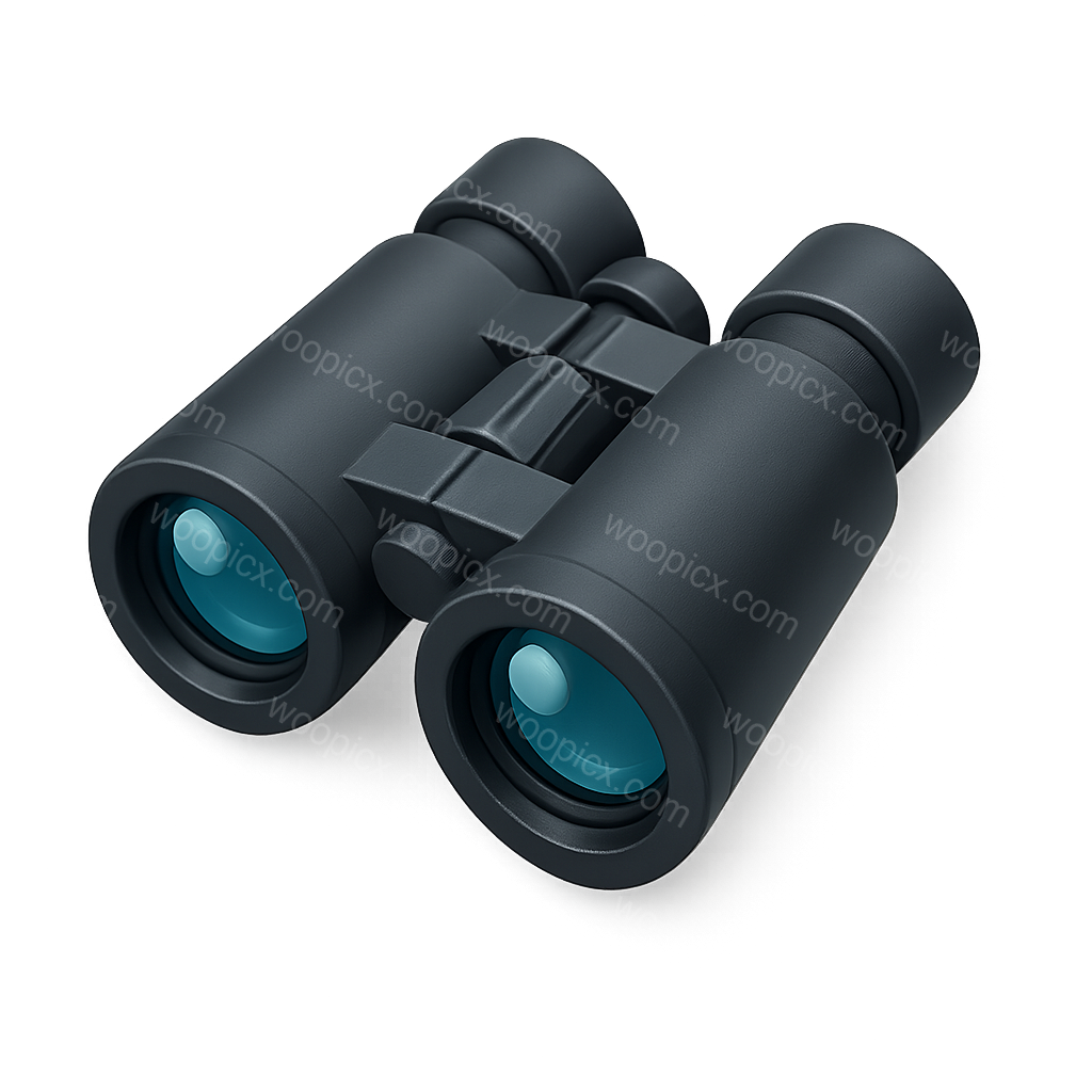 A sleek 3D icon of binoculars viewed from a three-quarter angle, featuring a transparent background and volumetric details, emphasizing a modern isometric design.