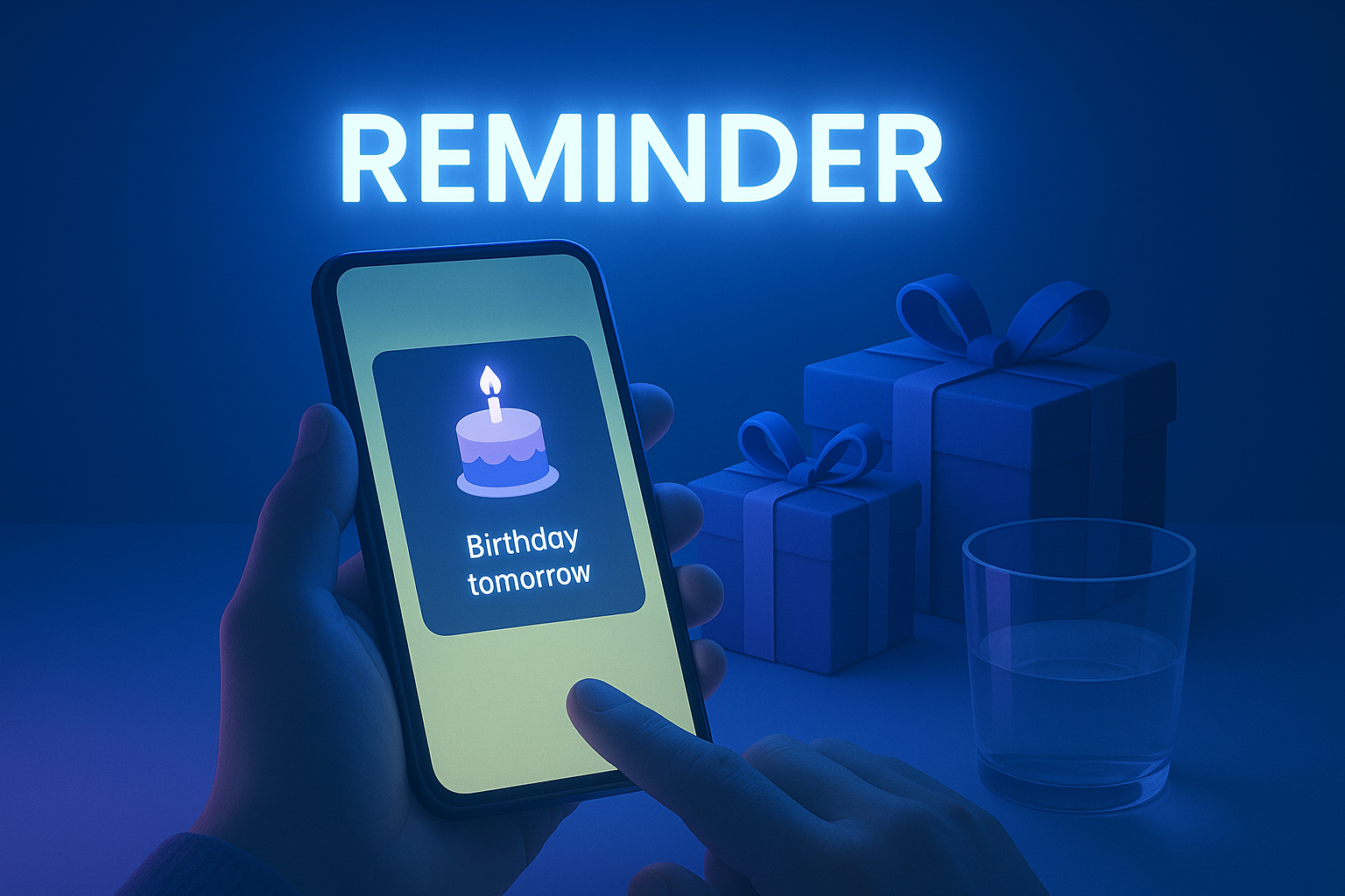 A person interacts with a smartphone displaying a birthday reminder, surrounded by virtual gifts and a translucent glass, all illuminated by a glowing text.