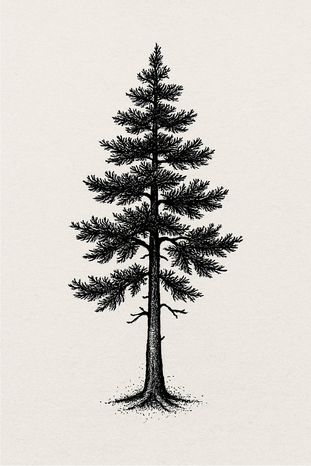 This image features a detailed black and white illustration of a coniferous tree, showcasing intricate line work and shading, ideal for nature-themed designs.