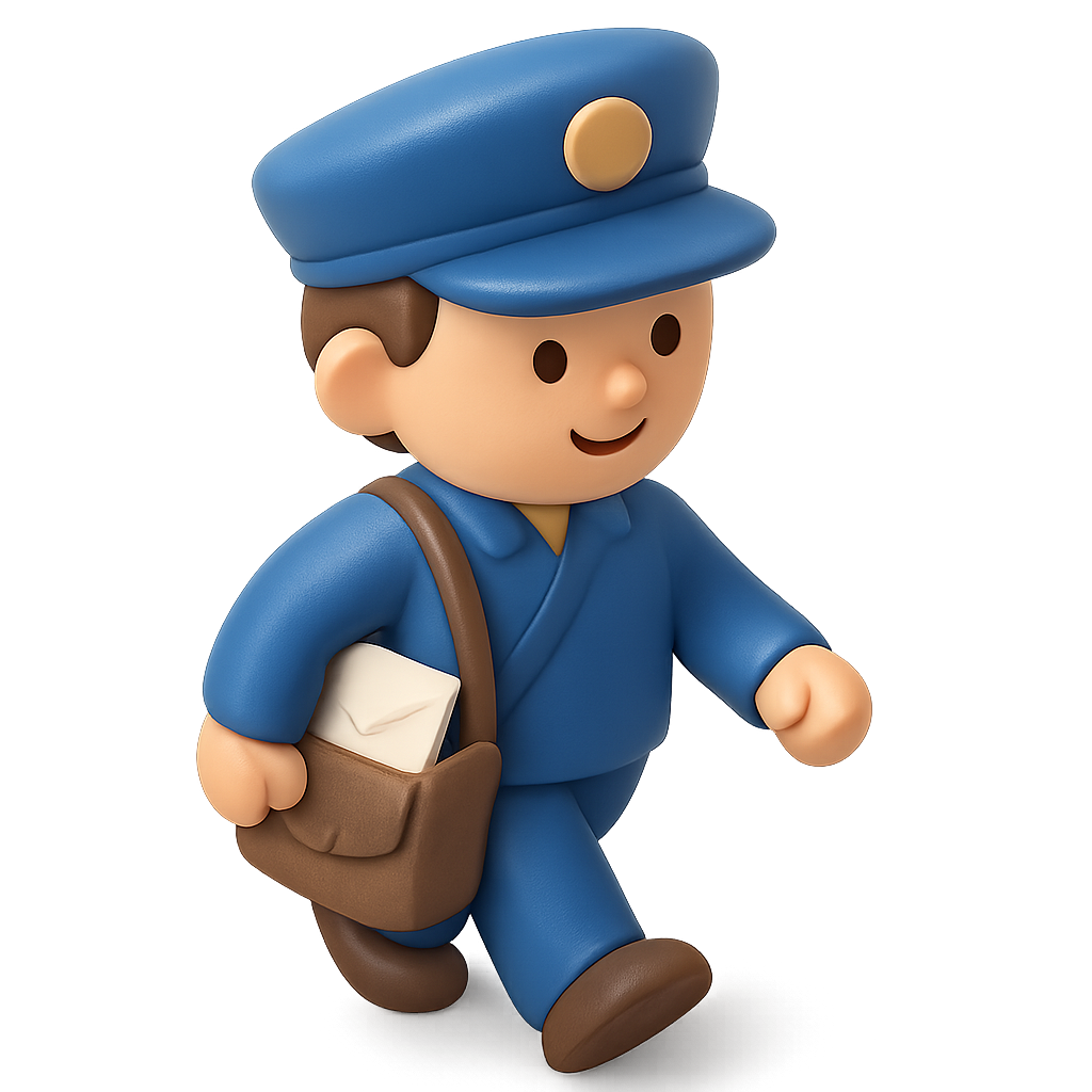 A charming 3D icon of a mail carrier in a blue uniform, carrying a bag and a letter. The character is depicted in a three-quarter view with a soft, volumetric style.